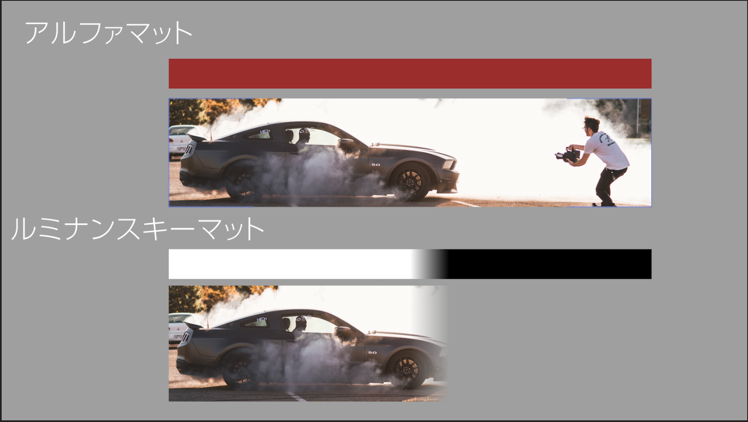 After Effects、Premiere Pro含めトラックマットは「アルファマット」、「トラックマット」に分けられます。これに加えて通常の合成を反転させるオプションもあり、合計4つのモードから選ぶことが出来ます。