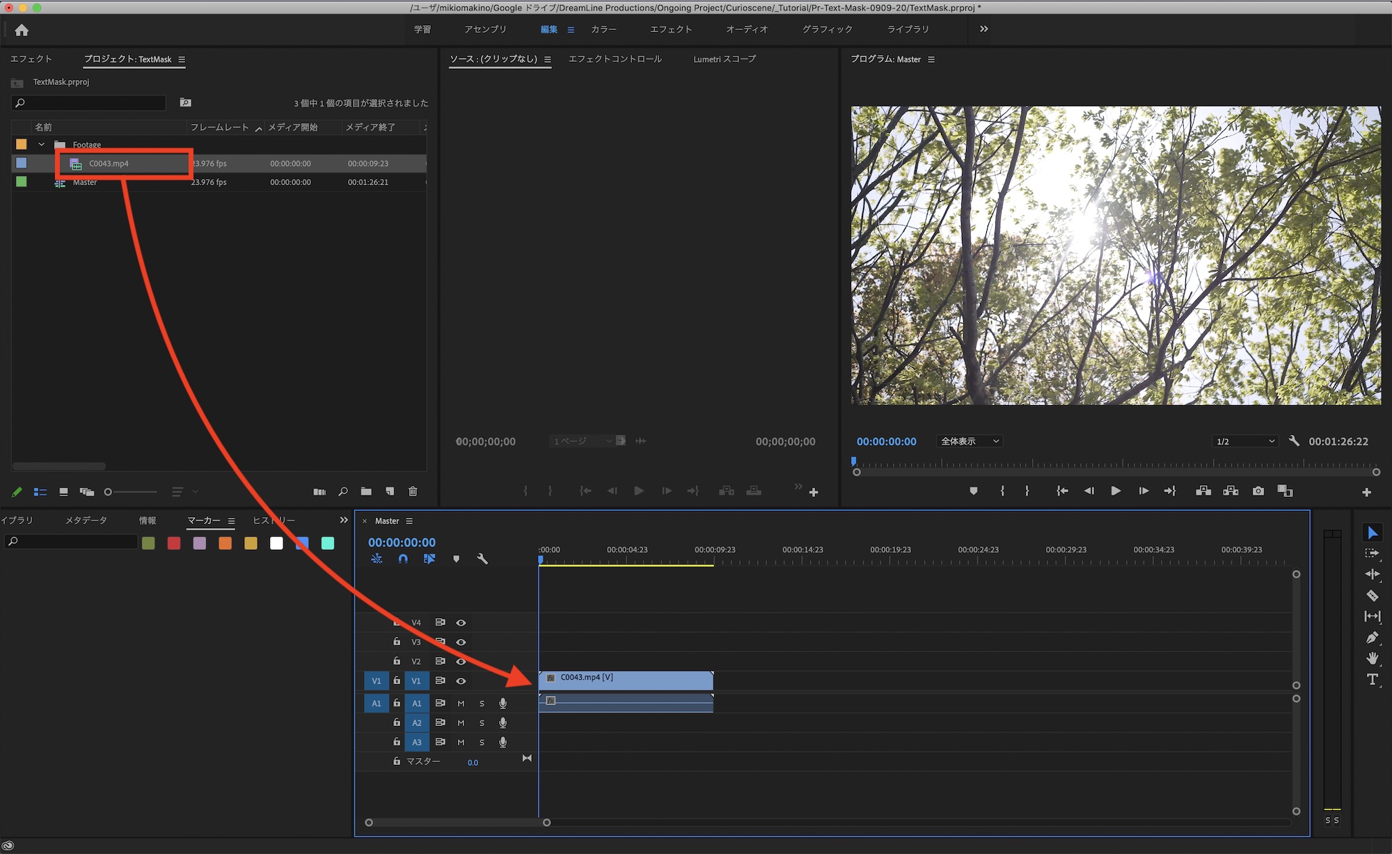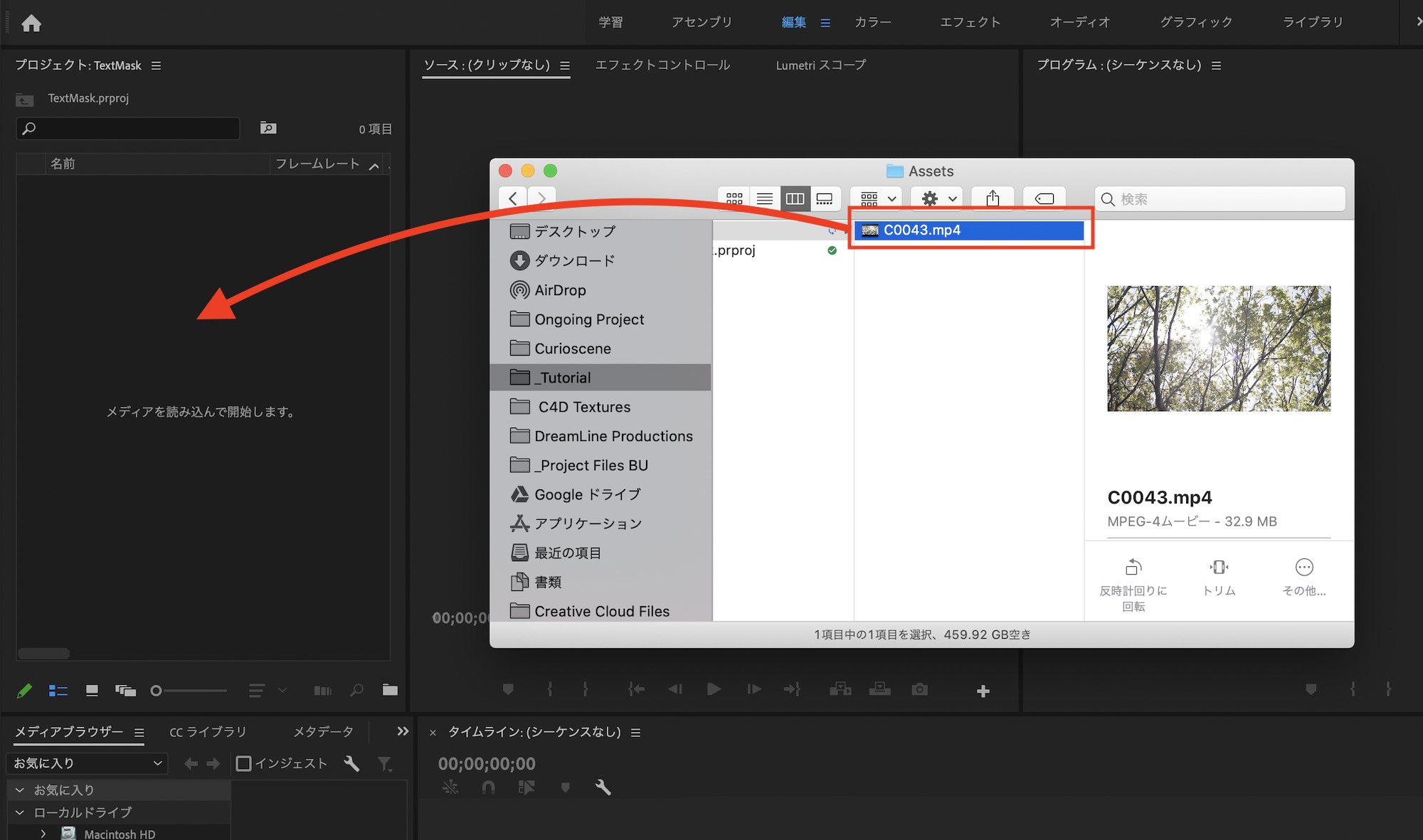 「編集」の項目を開き、テキストレイヤーの下に合成で使用するクリップをプロジェクトウィンドウからドラッグ・アンド・ドロップします。