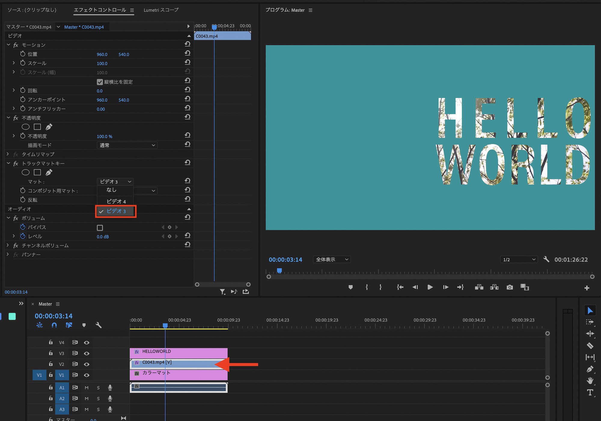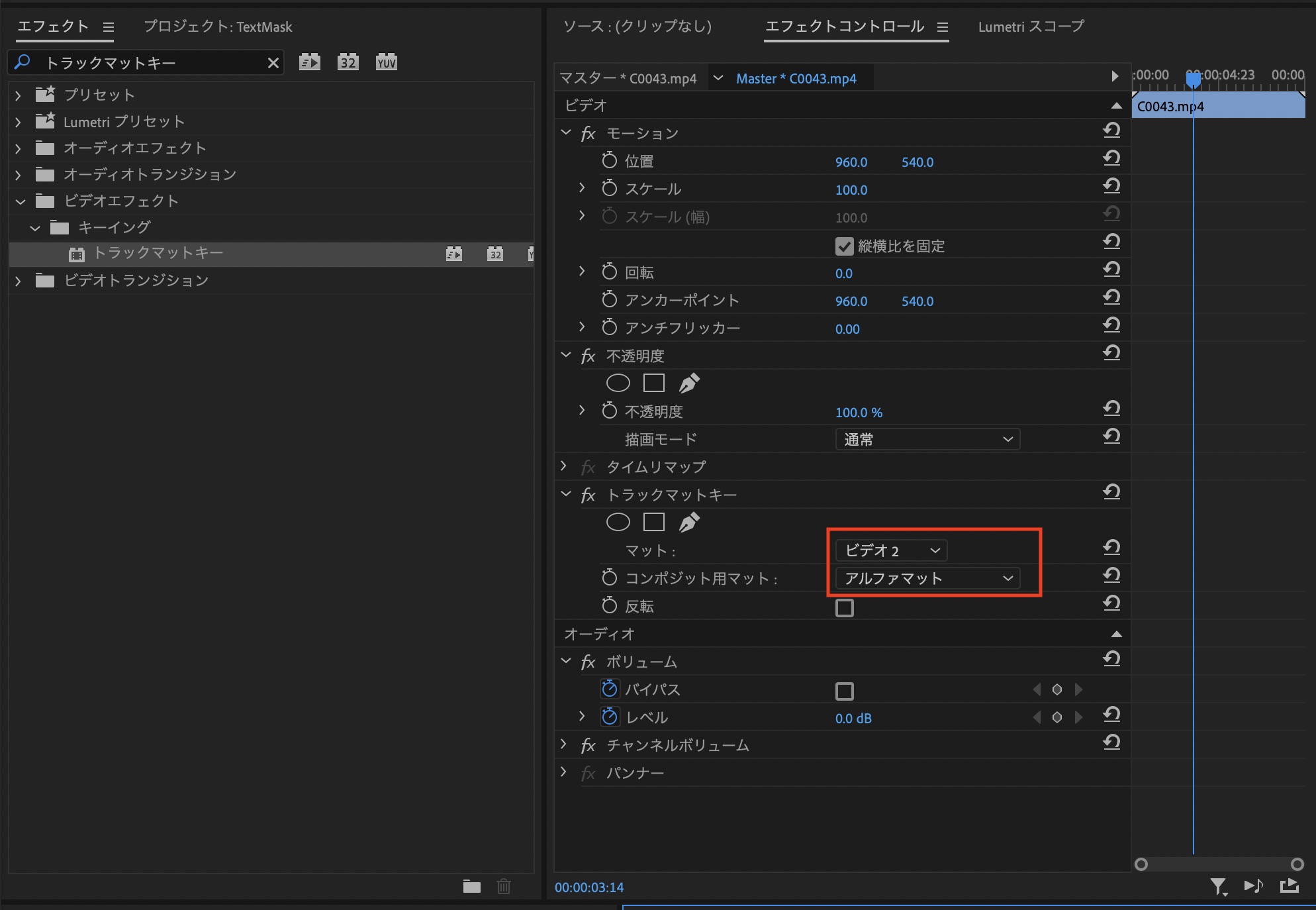 クリップを選択してエフェクトコントロールタブを開き、「トラックマットキー」の「マット」の項目から「ビデオ2」を選択し、「コンポジット用マット」では「アルファマット」を選びます。