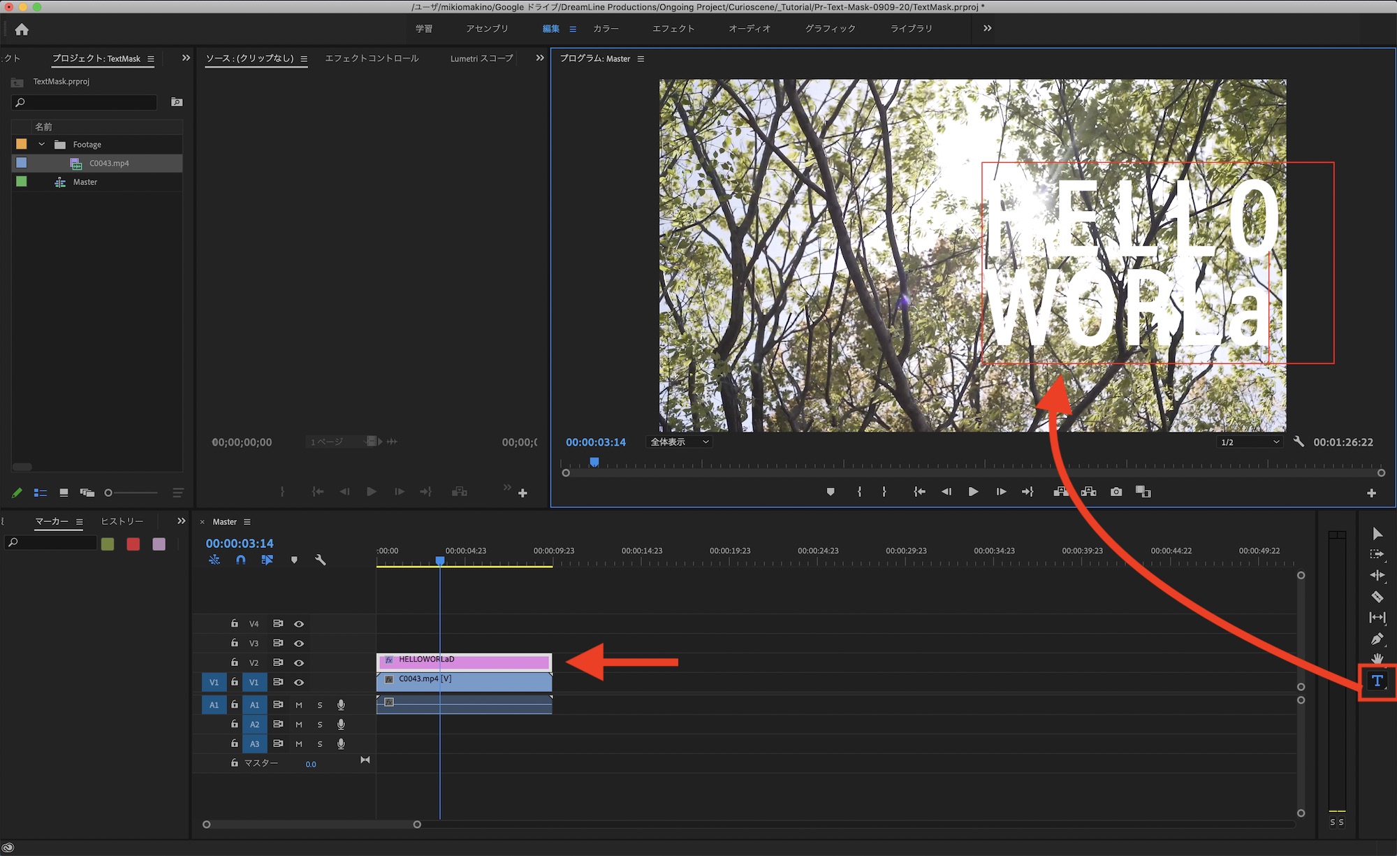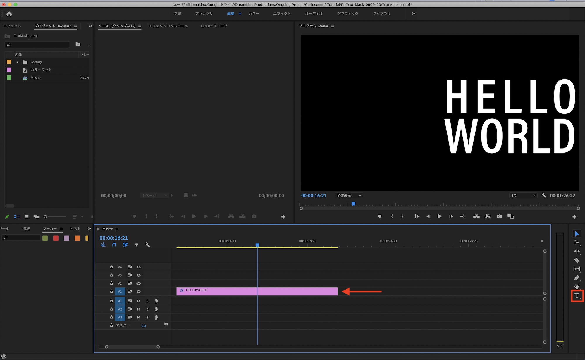 テキストツールを使ってタイトルを作成します。こちらの方法を使う場合は合成に使うクリップをシーケンスに追加する必要はありません。