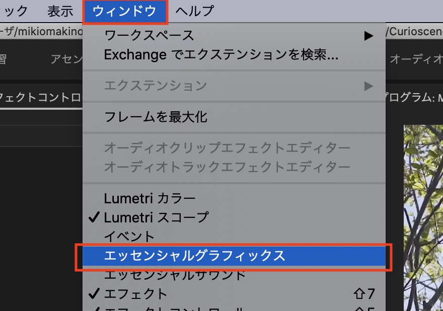 タイトルのデザインが完了したら、上部メニューの「ウィンドウ」の項目から「エッセンシャルグラフィクス」を選択しタブを開きます。
