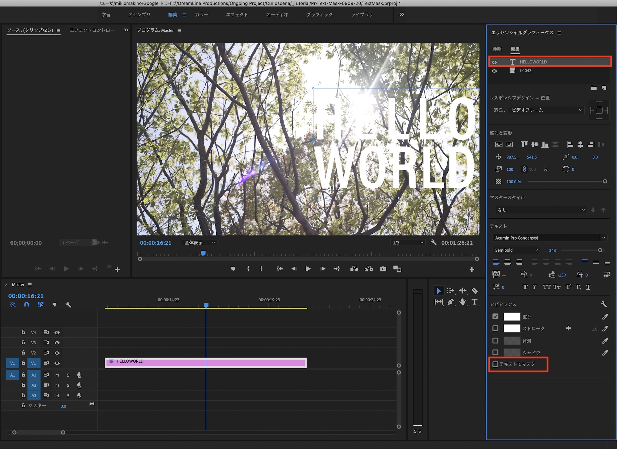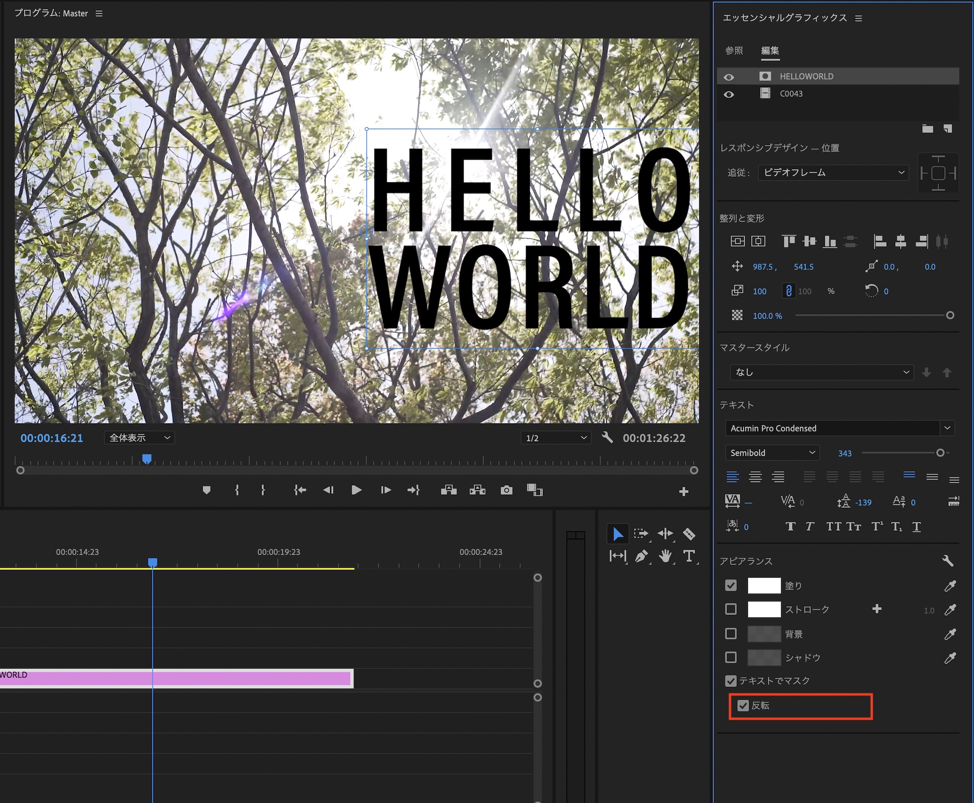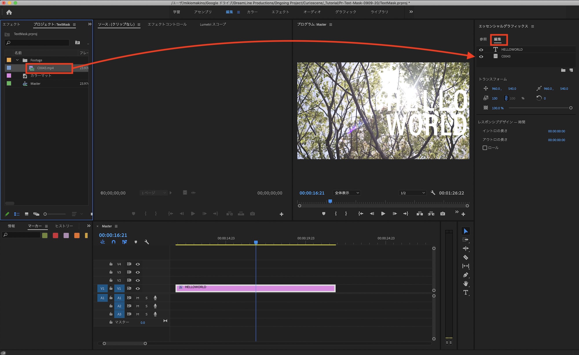 先程の「トラックマットキー」のエフェクトに比べてより簡単に作成したい場合はエッセンシャルグラフィクスのタブから作成するのがベストです。