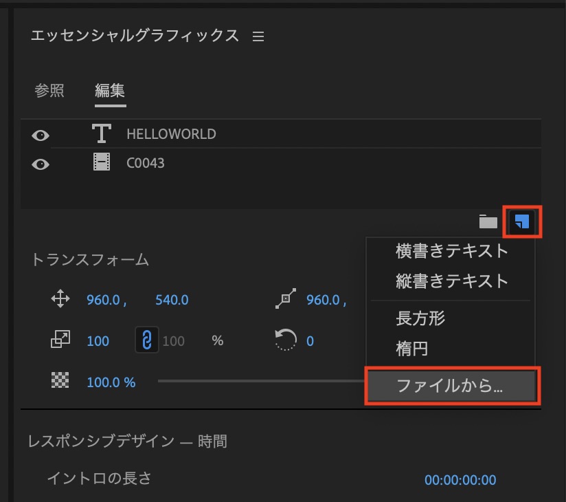 エッセンシャルグラフィックスのタブにある「新規ファイル」、「ファイルから」を選んで読み込むことも可能です。