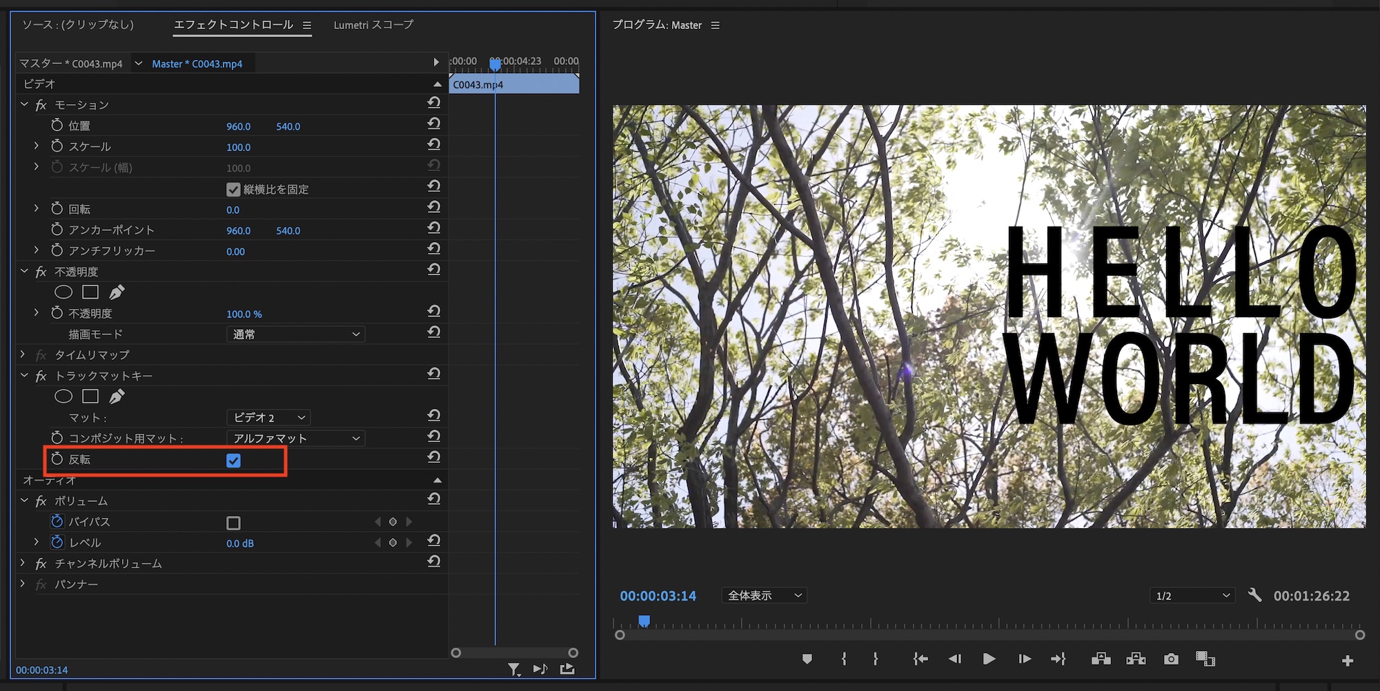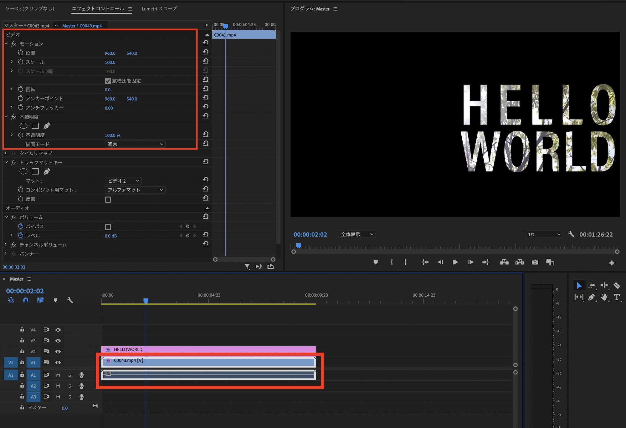 トラックマットキーのエフェクトを使用した場合はクリップのレイヤーを選択して、「モーション」の項目から各種プロパティを設定できます。