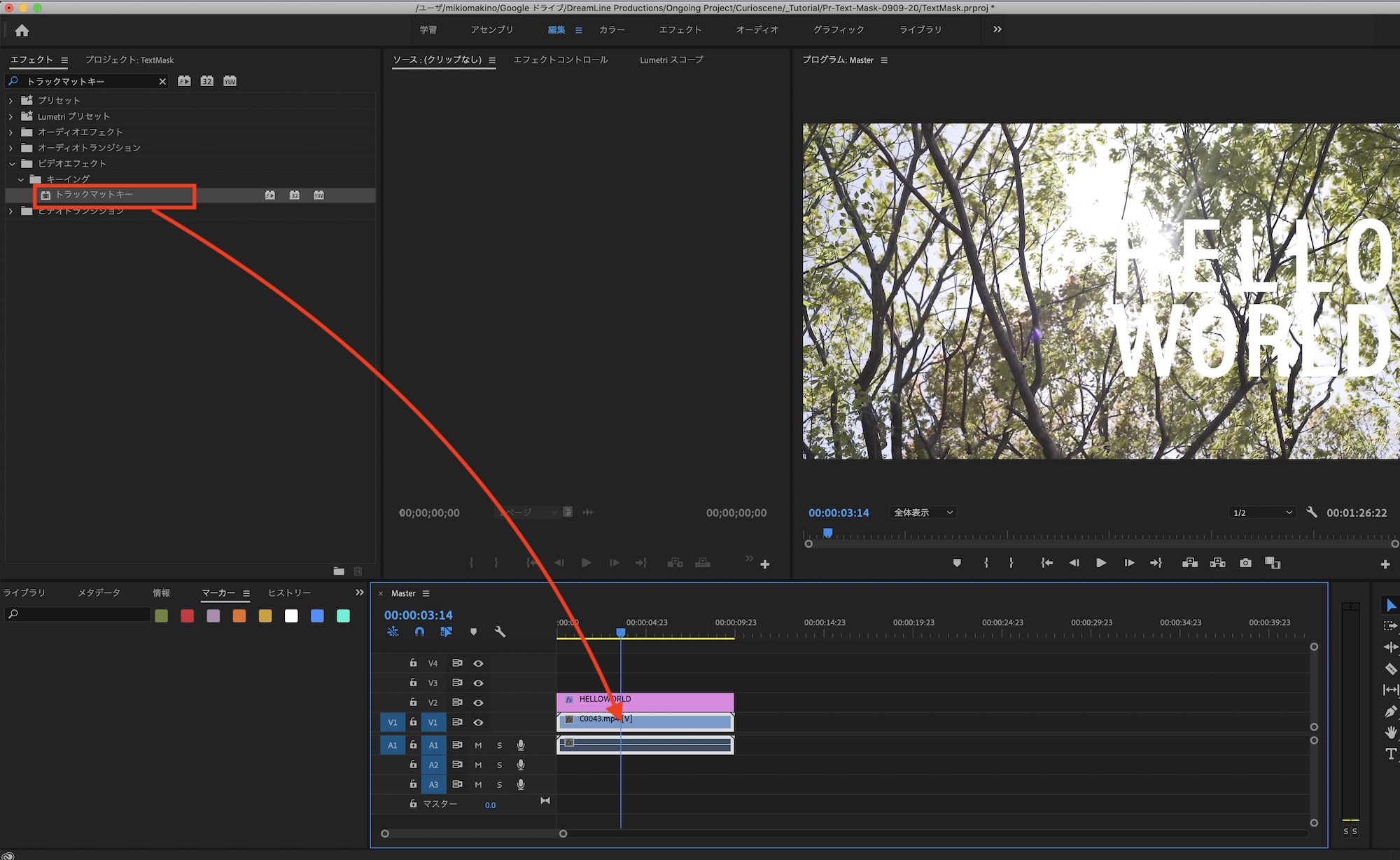 テキストのデザインが完了したら、エフェクトタブから「トラックマットキー」を検索してエフェクトをレイヤーV1に配置しているクリップにドラッグ・アンド・ドロップしましょう。