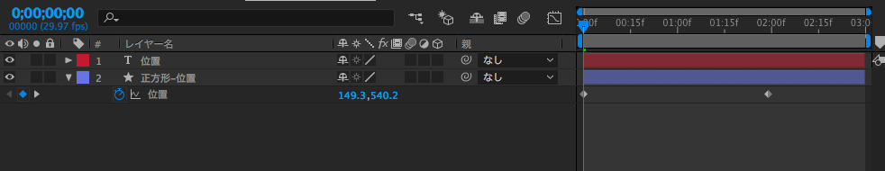 今度はタイムラインに移って、タイムインディケーターを0秒に持っていき、シェイプレイヤーの「▶」をクリックして、中にある「トランスフォーム」を展開し、「位置」のストップウォッチアイコンをクリックします。