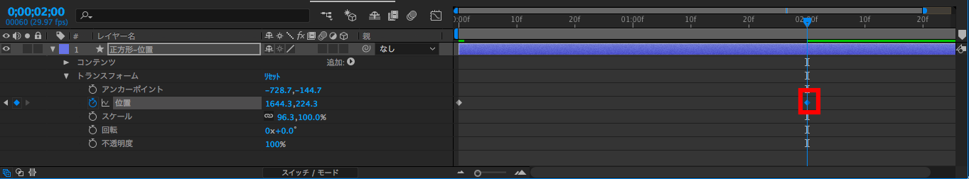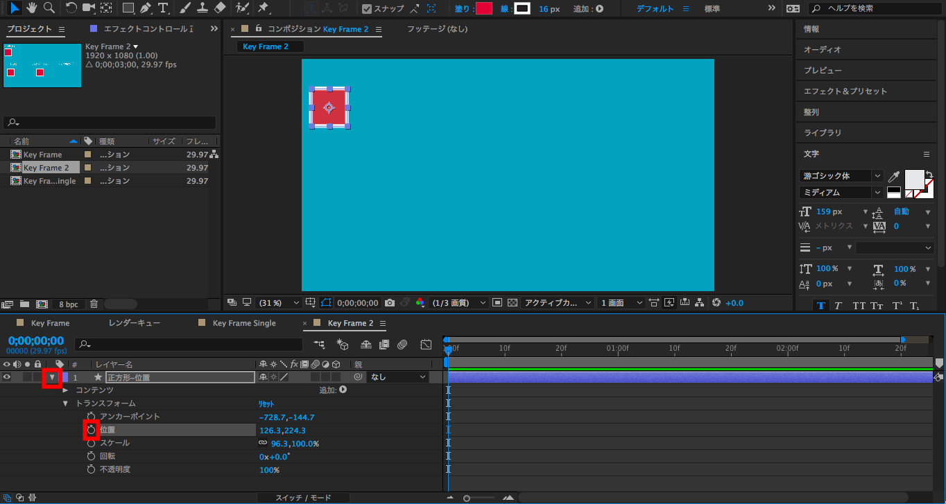 下の例では位置の他に良く使うであろう、3つのプロパティにキーフレームを追加してみました。