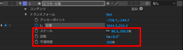 シェイプレイヤー内にあるトランスフォームの項目を見ればわかると思いますが、位置の他にもスケール、回転、不透明度などのプロパティがあります。こちらも位置と同じようにアニメーションの初めと終わりにキーフレームを追加してそれぞれの数値を変更することでアニメーションを加えることが出来ます。