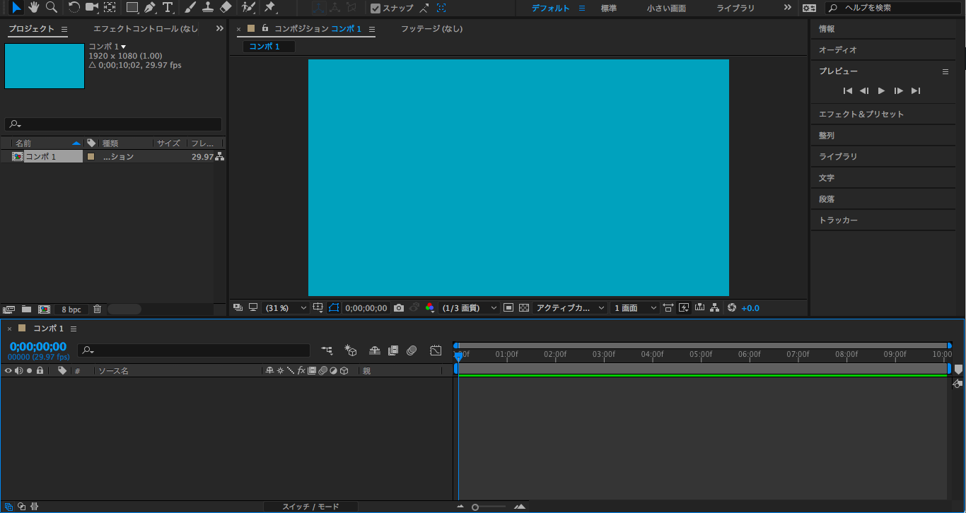 試しに正方形の位置を左から右に動くアニメーションを作ってみましょう。まずは新規コンポジション・新規プロジェクトの設定を行い、コンポジションを作成します。
