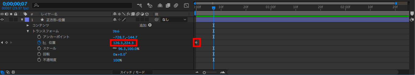 するとタイムラインの位置の欄にひし形(◆)のアイコンが出てくるのですが、これがAfter Effectsのキーフレームです。筆者の例だと「0秒に126.3,224.3の位置」として記録されています。