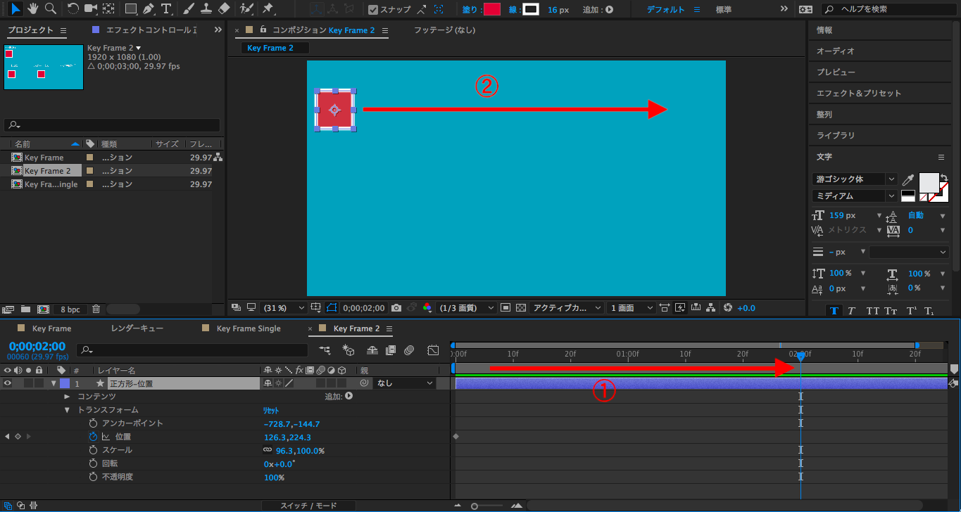 今度はタイムインディケーターを2秒に動かして、正方形を画面の右に持っていきます。