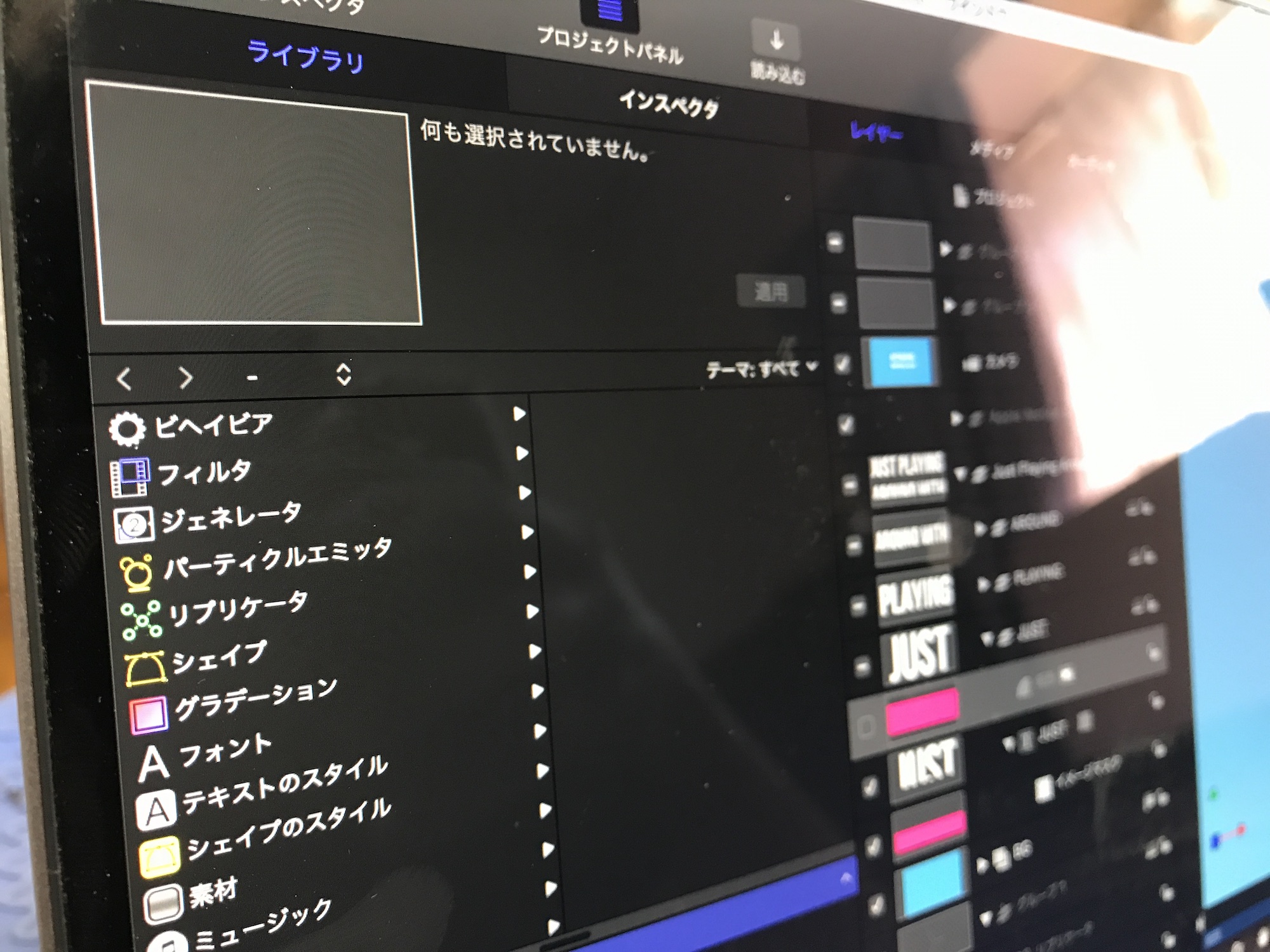 After Effectsであればシェイプやテキストなどのオブジェクトがレイヤーとしてタイムラインに表示されていますが、Motionの場合だとレイヤーの一覧が「レイヤー」のタブに、キーフレーム操作や長さの調整は「タイムライン」に、そしてプロパティの設定は「インスペクタ」で行う必要があります。