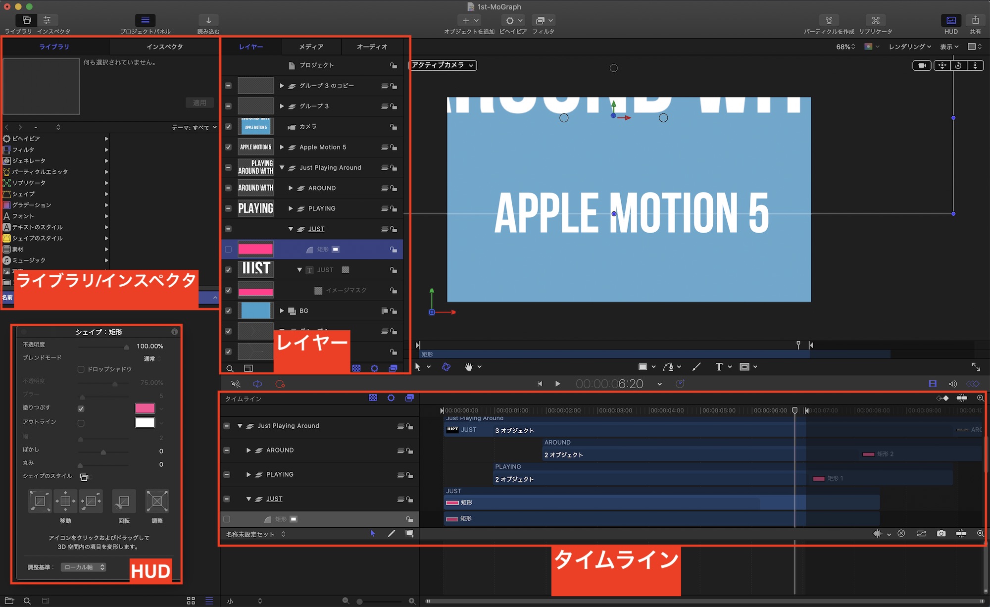 こちらで使用したツールは主にテキストとシェイプ、イメージマスクやキーフレーム、カメラ、そしてリプリケータなどです。ここでは全て紹介できないので、また別の機会にMotion 5の使い方を詳しく紹介したいと思います。