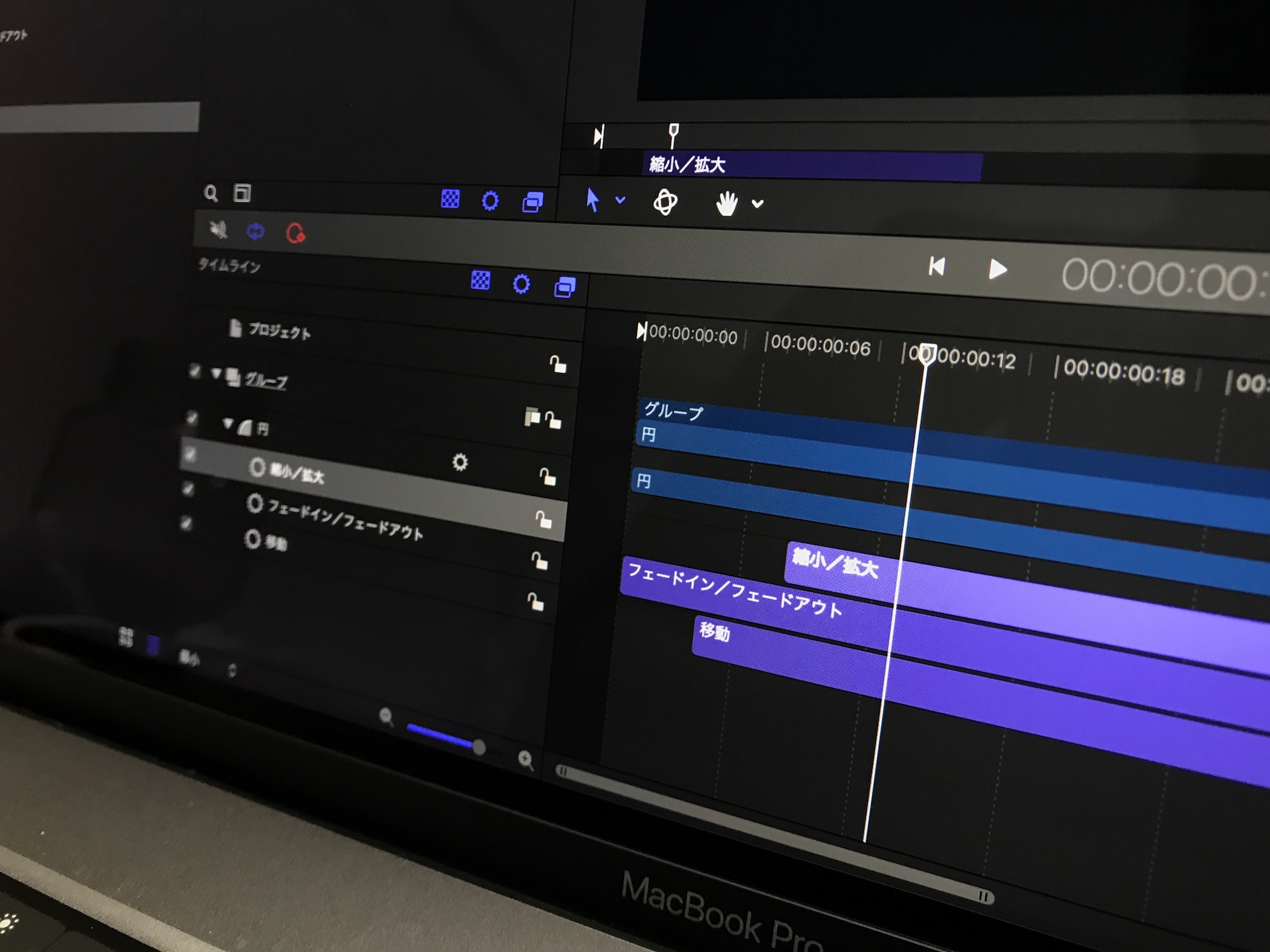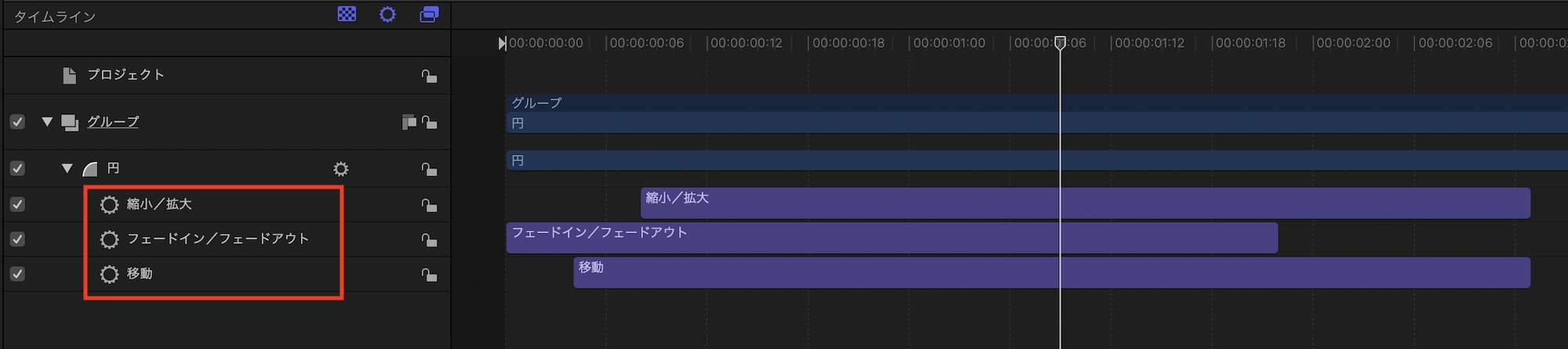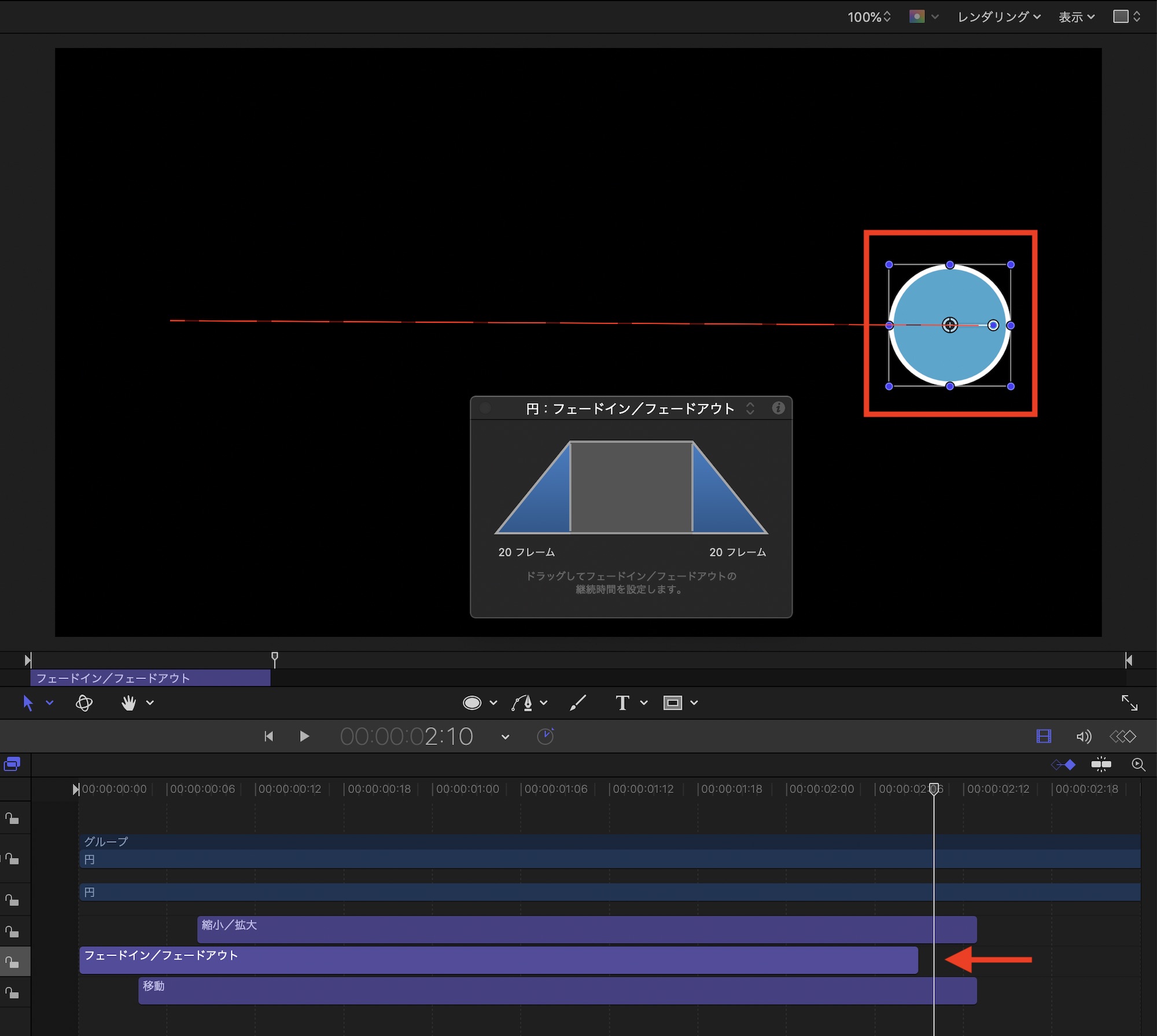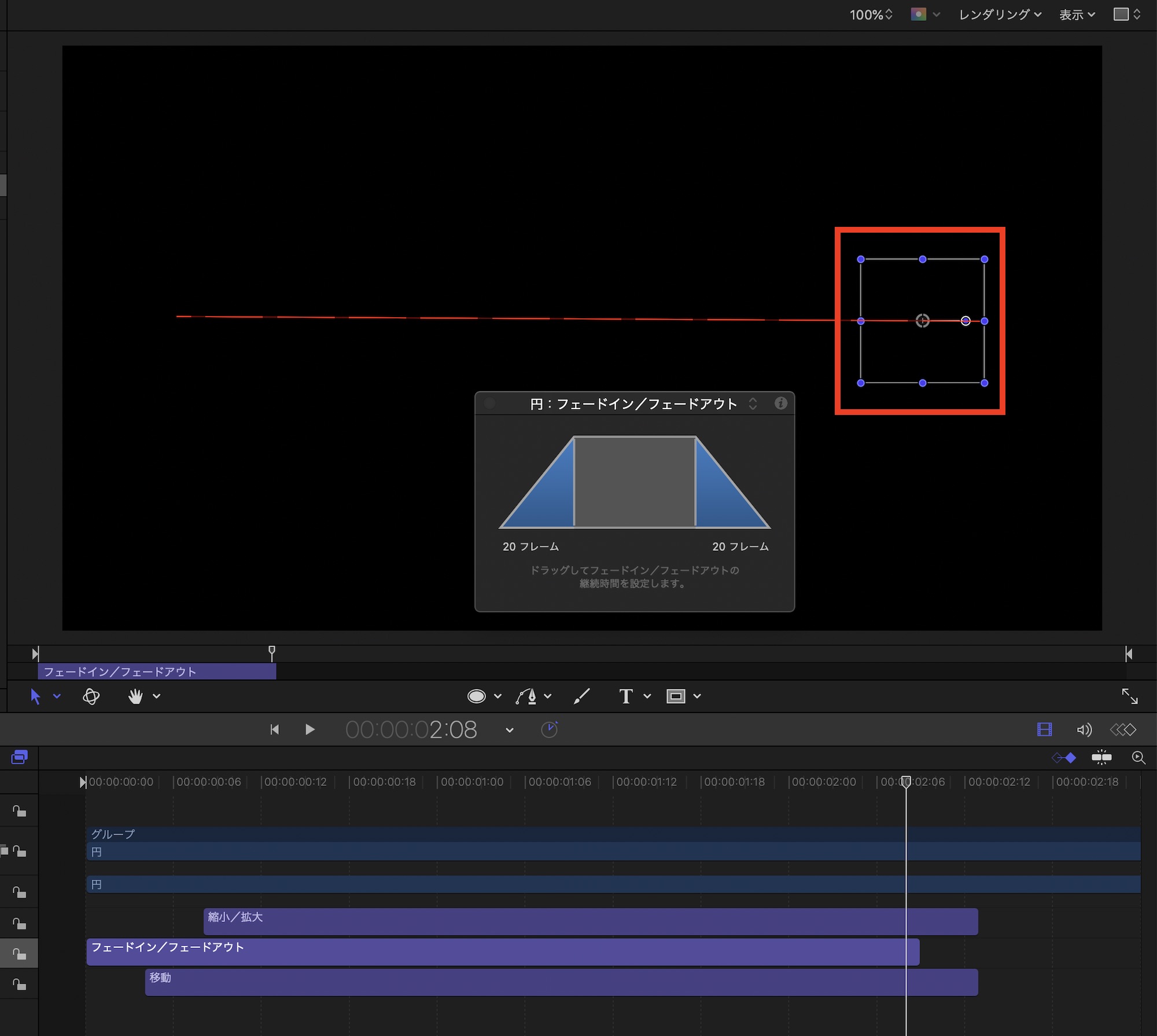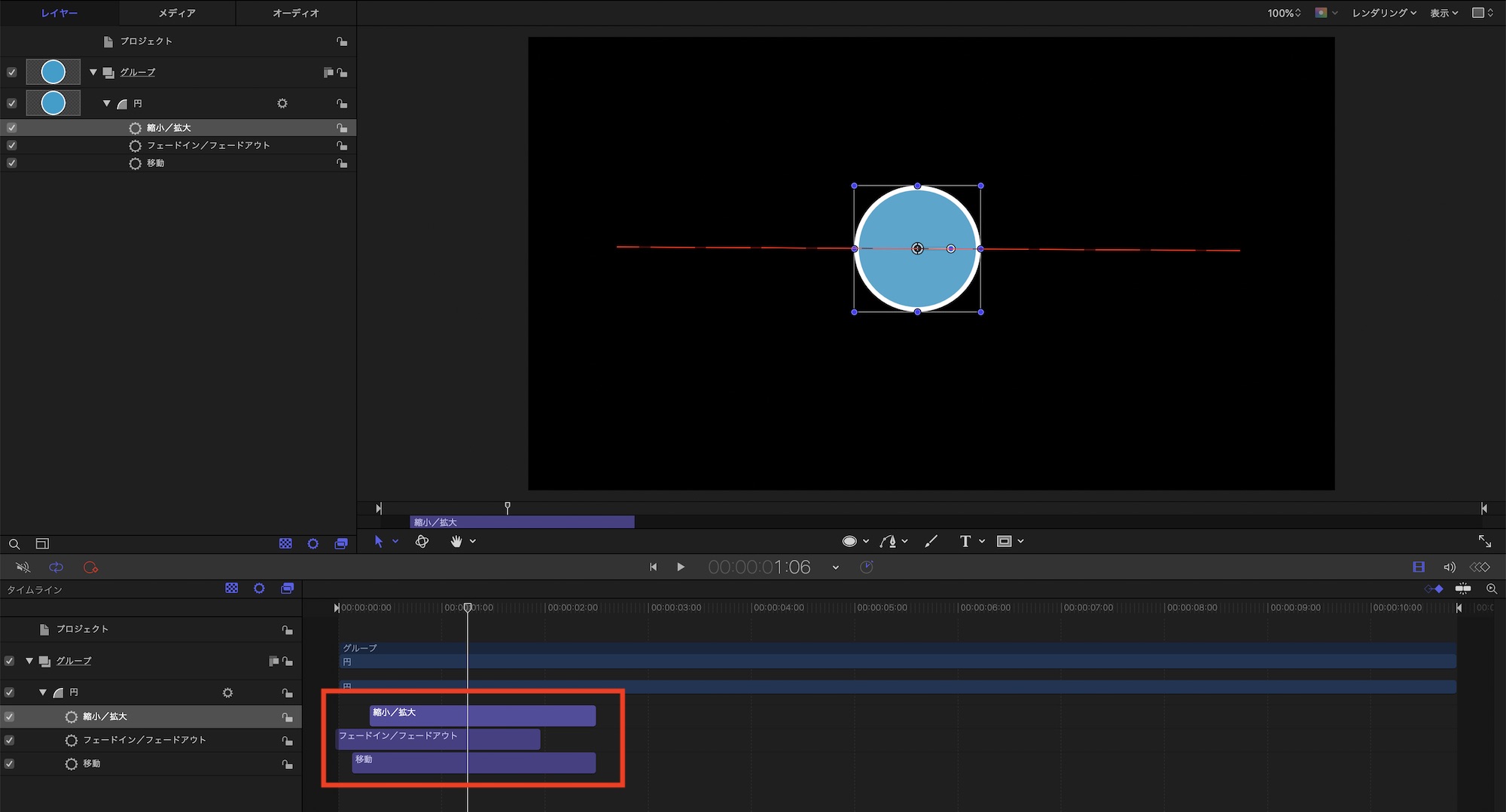 しかし、Motionの場合であれば必要なビヘイビアをオブジェクトにドラッグ・アンド・ドロップ、ビヘイビアの長さ調整だけで同じようなアニメーションを作ることが出来ます。