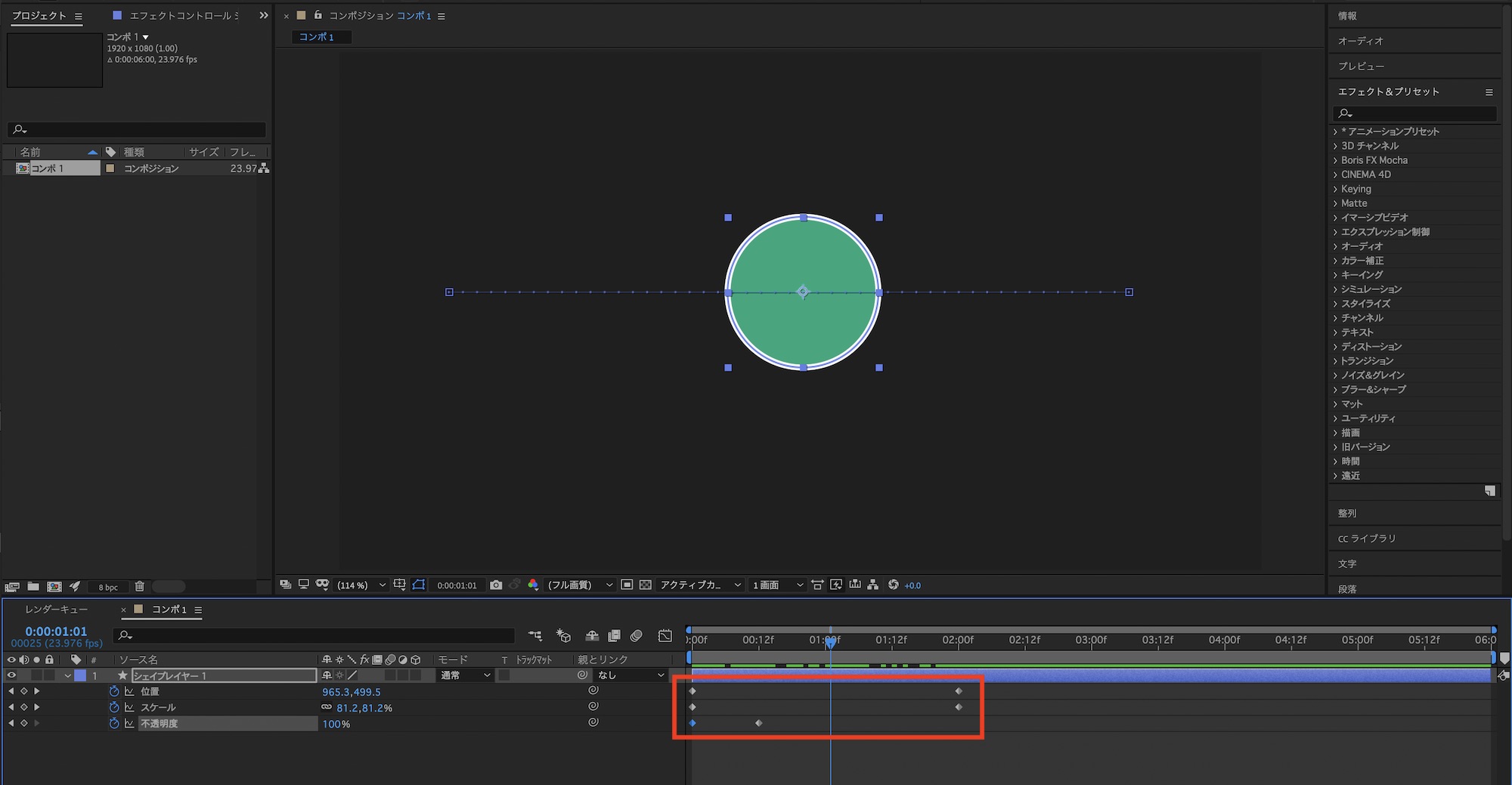 Apple Motion 5とAdobe After Effectsの2つを使ってシェイプに位置やスケール、不透明度の変更を行ってみましょう。After Effectsの場合は下のように複数のキーフレームを追加し、タイミングを見ながら調整する必要があります。