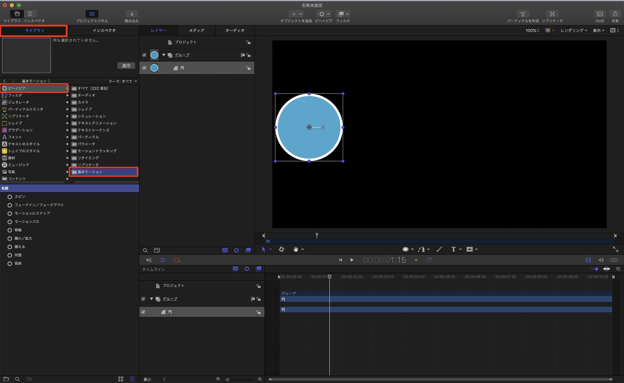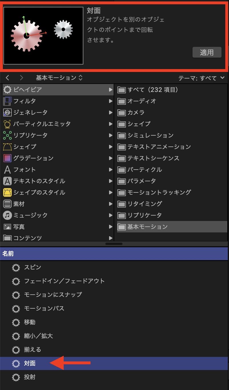 Motionのライブラリから「ビヘイビア」を選択するとカテゴリごとにフォルダ分けがされているので、フォルダをクリックして適用したいビヘイビアを選択しましょう。位置やスケール等といったものに関しては「基本モーション」に格納されています。