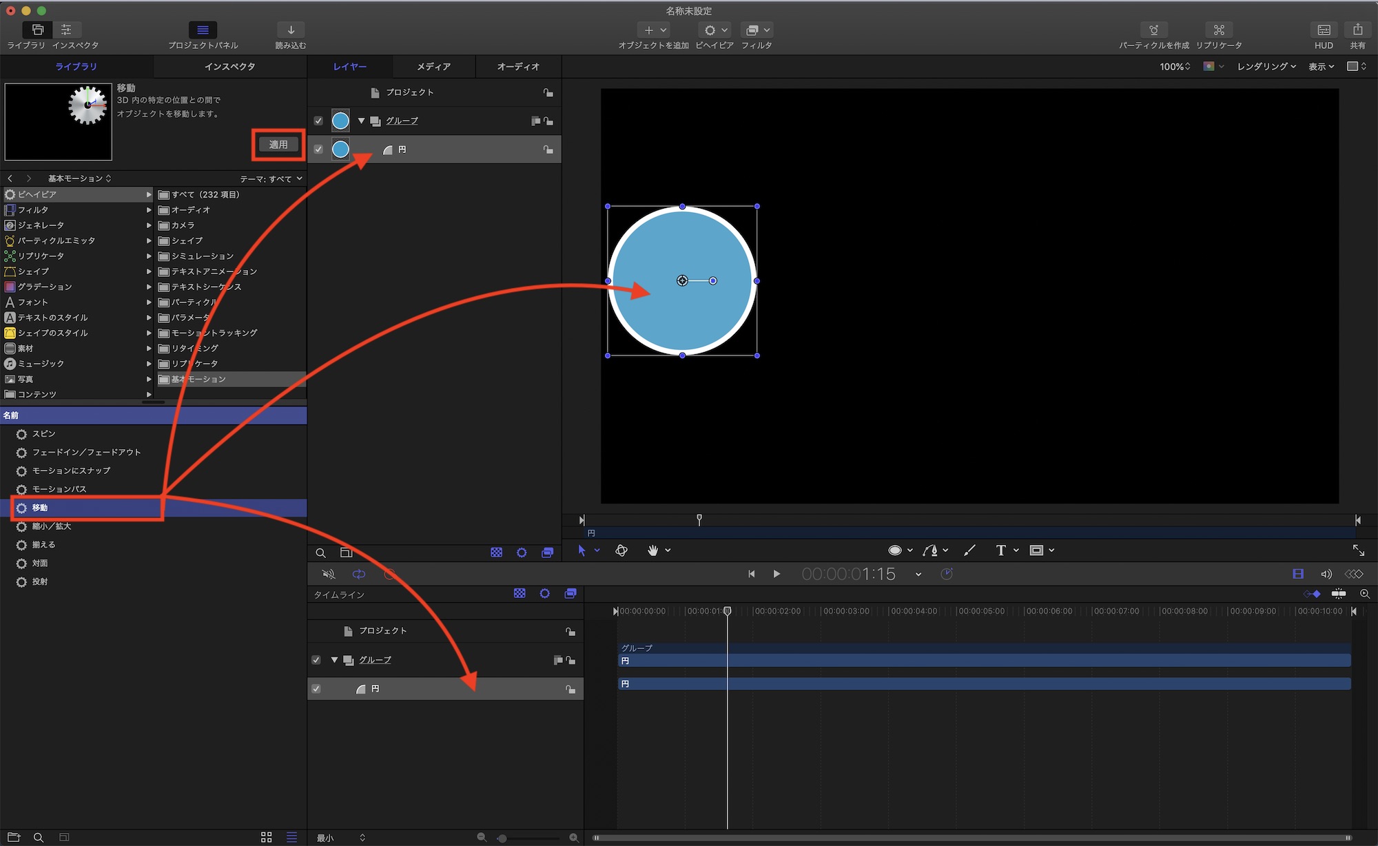 適用するビヘイビアを選択して「適用」をクリックするか、レイヤーやタイムライン、またはキャンバスにあるオブジェクトにドラッグ・アンド・ドロップするとビヘイビアが適用されます。