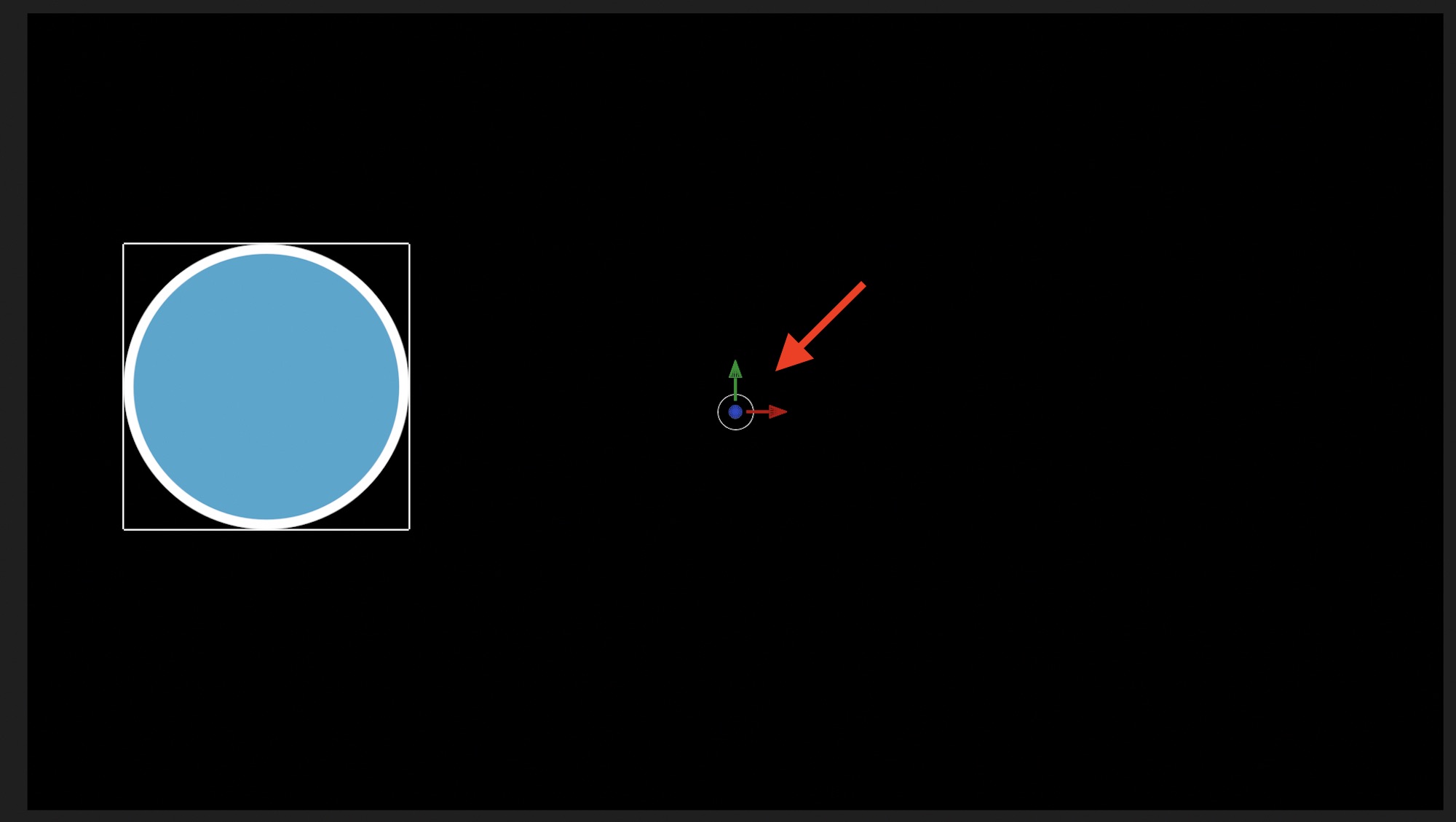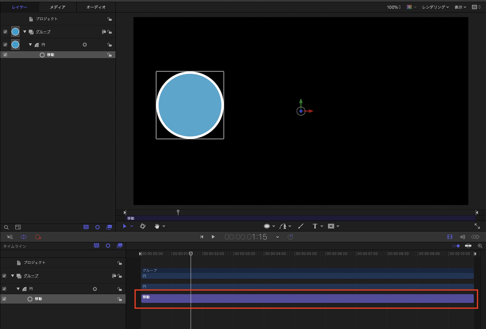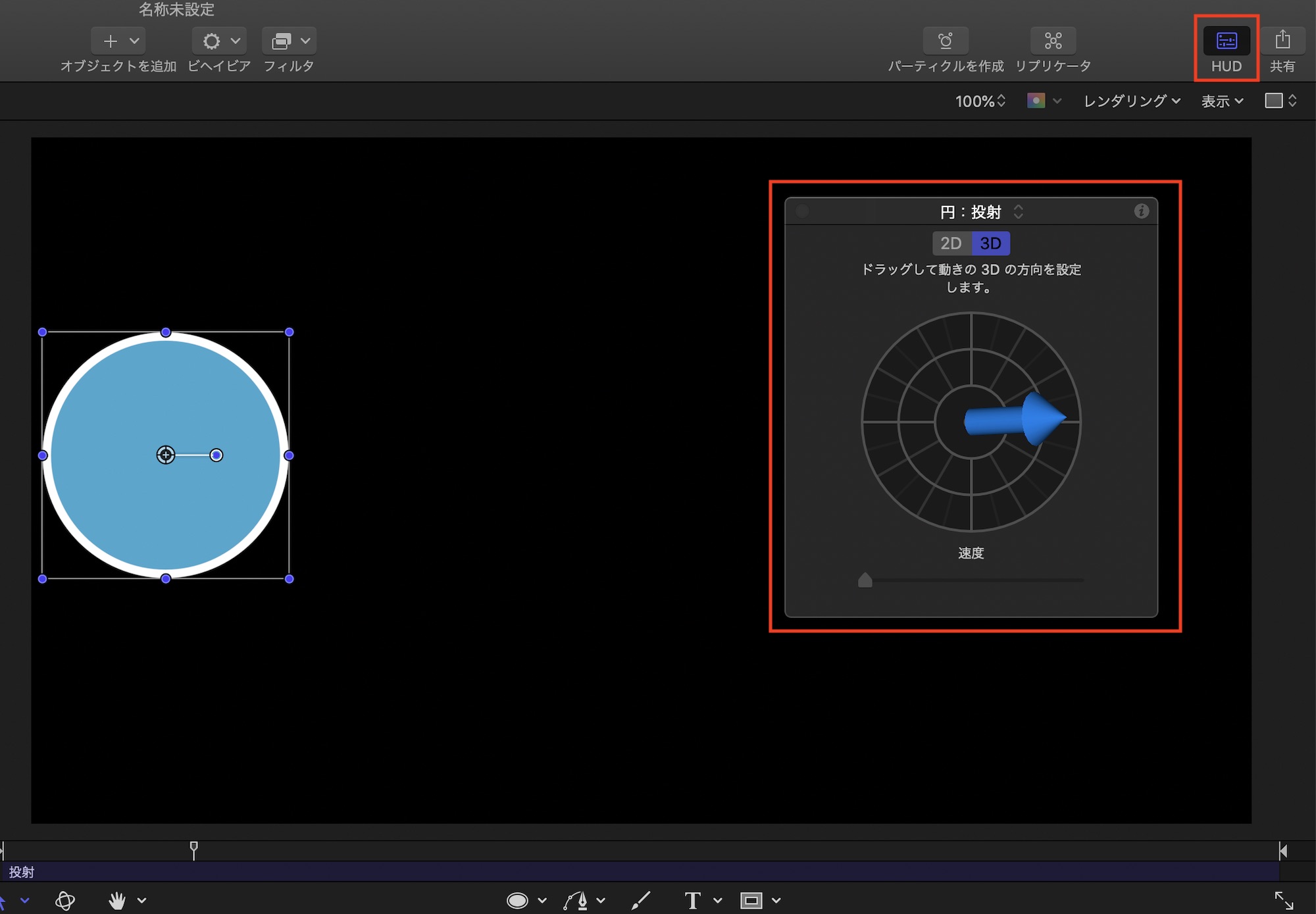 加えて、キャンバスで設定するものもあります。「基本モーション」の「移動」ビヘイビアを例にしてみると、キャンバス内に丸い円が追加され、動かす方向を設定することが出来ます。