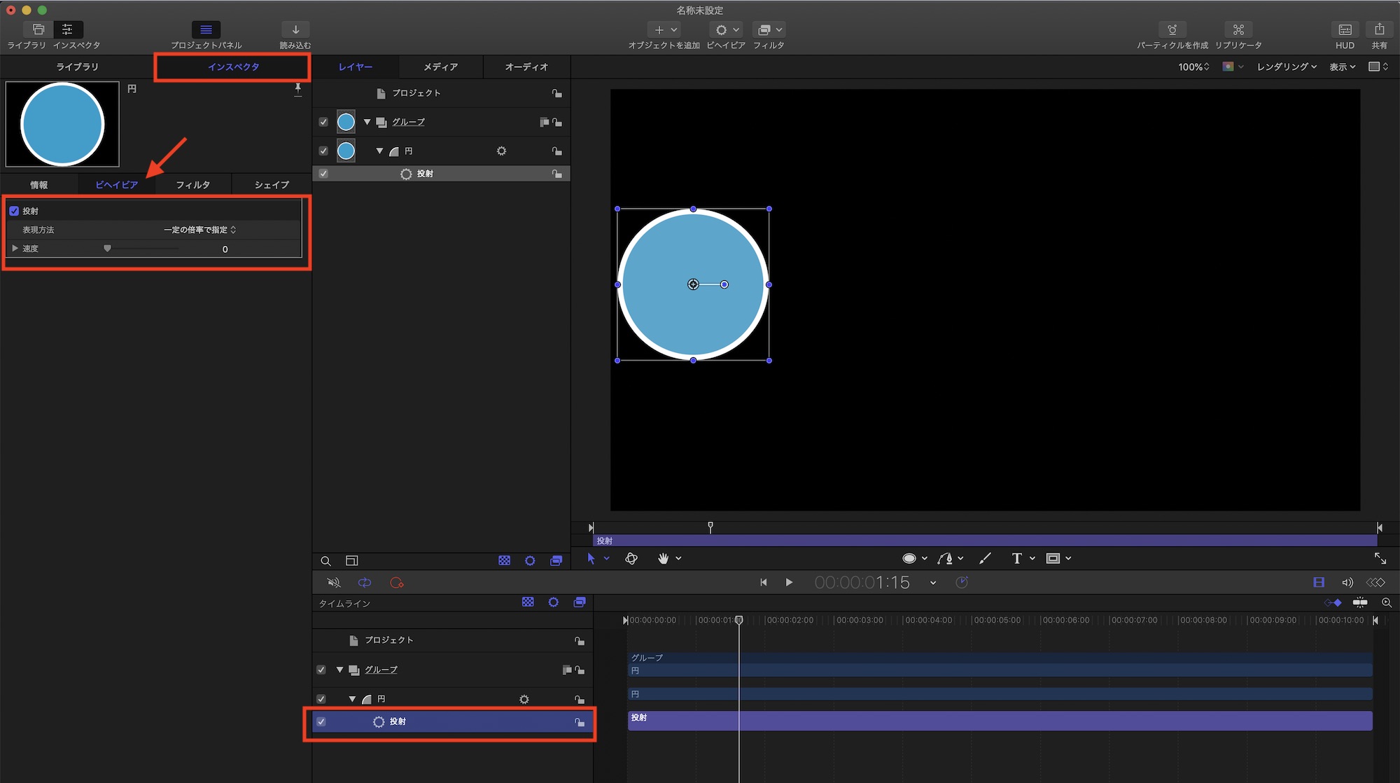 使用するビヘイビアによって使える設定や操作方法が変わってきますが、タイムラインでビヘイビアを選択してインスペクタを開くと全てのパラメーターを表示させることが出来ます。