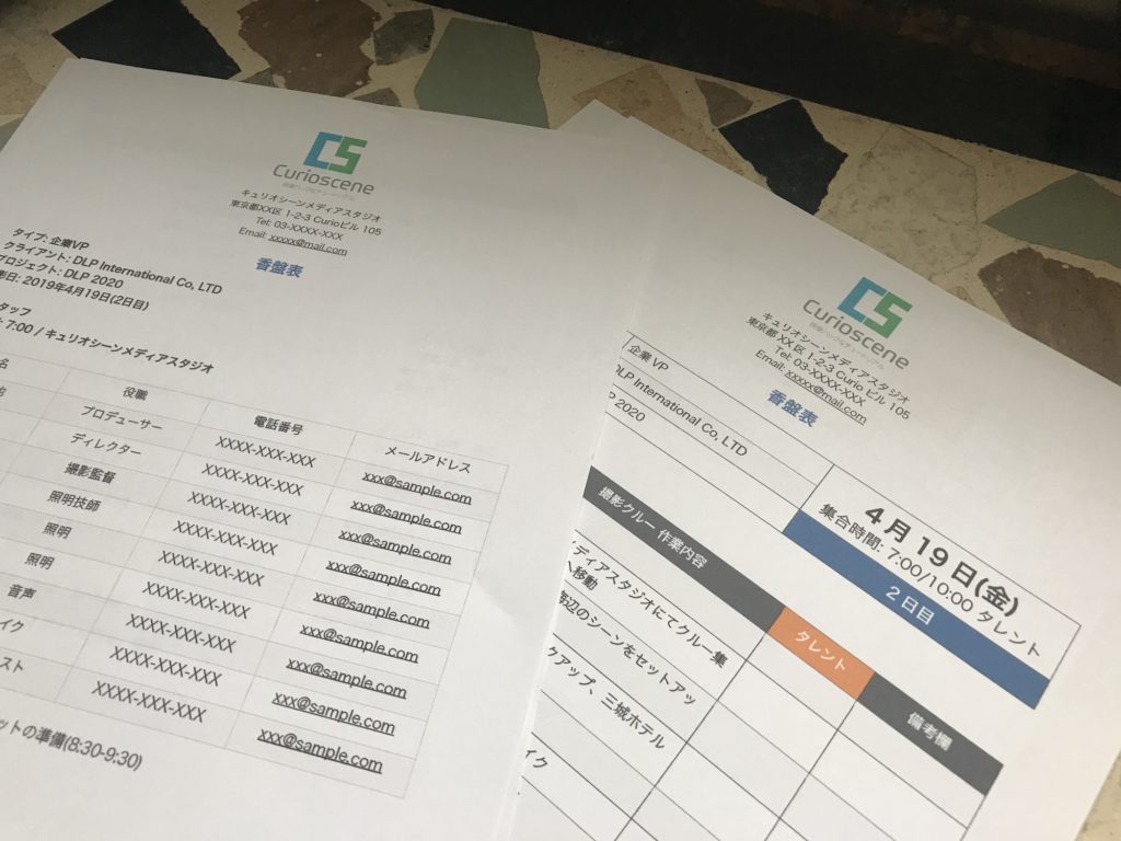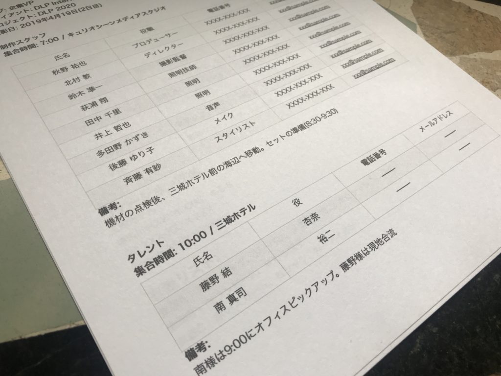 - クルーやタレントの連絡先 - プロデューサーなどに連絡が取れない時に他のクルーの電話番号やメールアドレス、役職などの詳細があると良いかもしれません。