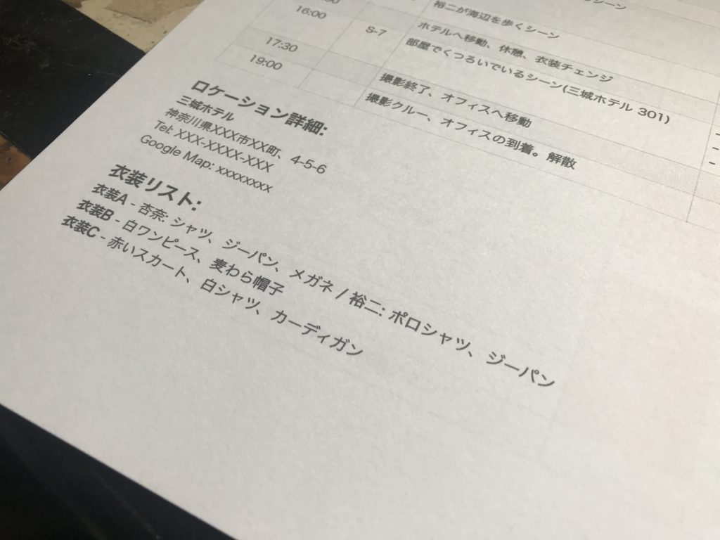 - ロケーションのマップや詳細 - 集合場所やシーンに必要なロケーションのマップや写真、照明に必要なコンセントや撮影ポイント詳細があると良いでしょう。