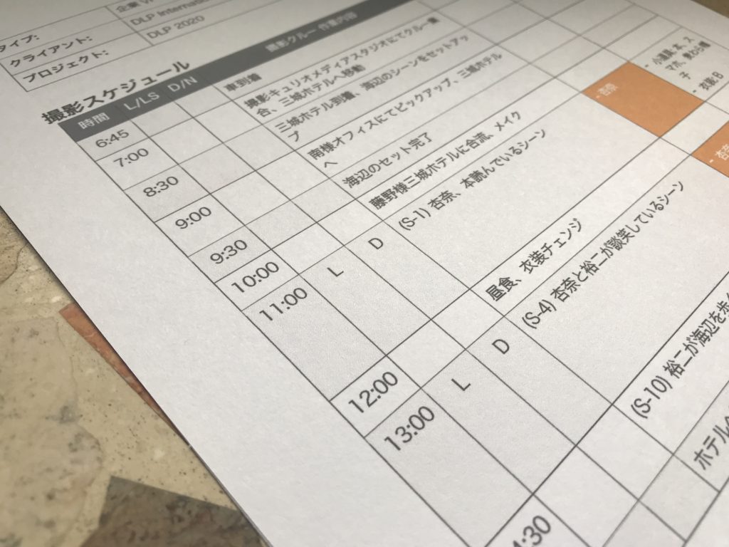 シーンごとに必要なリストが無いとプロダクションがカオスになってしまうので、それを防ぐために撮影前にはしっかりとスケジュールを組む必要があります。