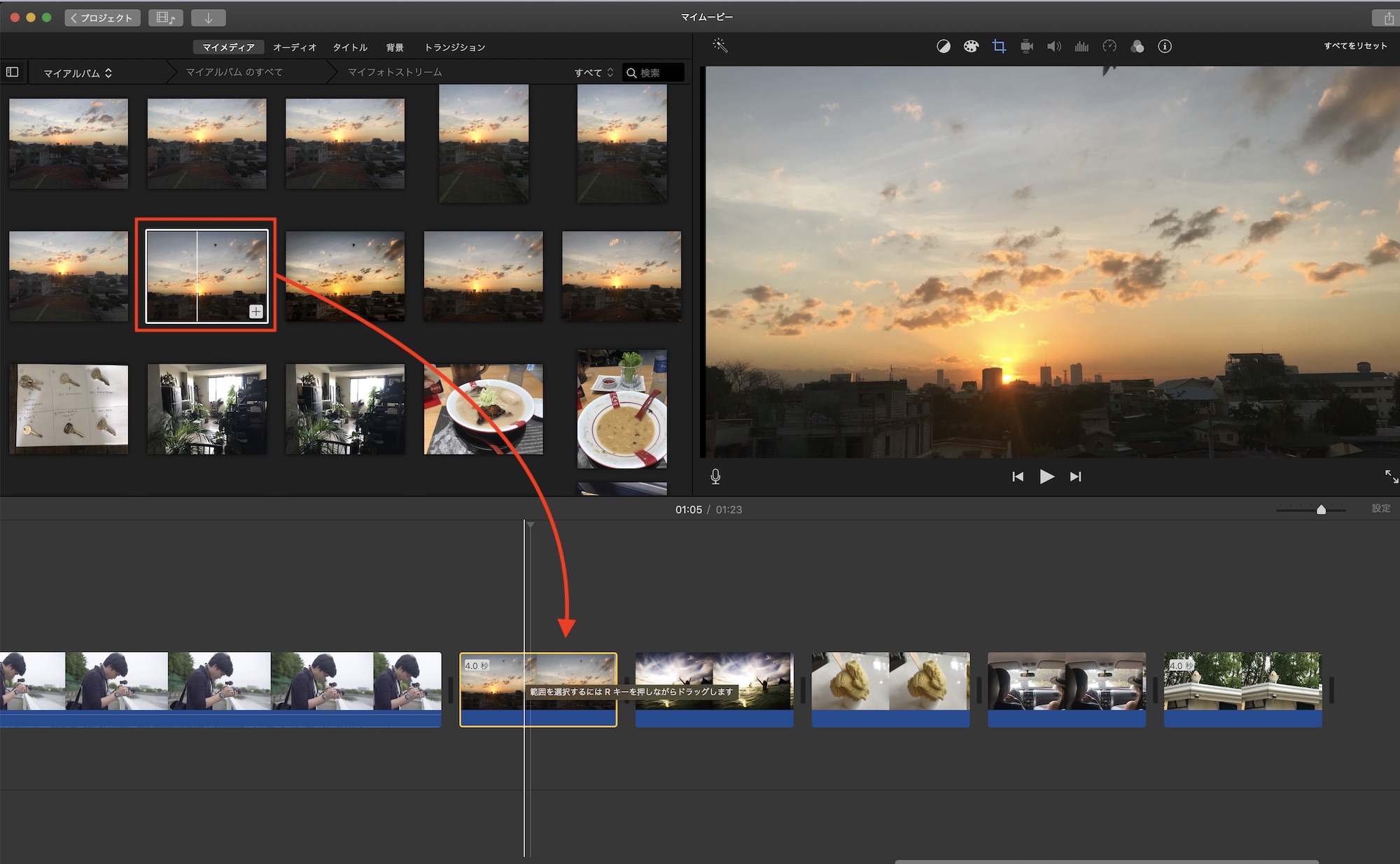 iMovieのタイムラインに写真を追加すると自動でKen Burnsのエフェクトが適用されるようになります。基本的にズームイン・アウトが使われますが、縦の写真だとチルトの動きが適用されるようです。