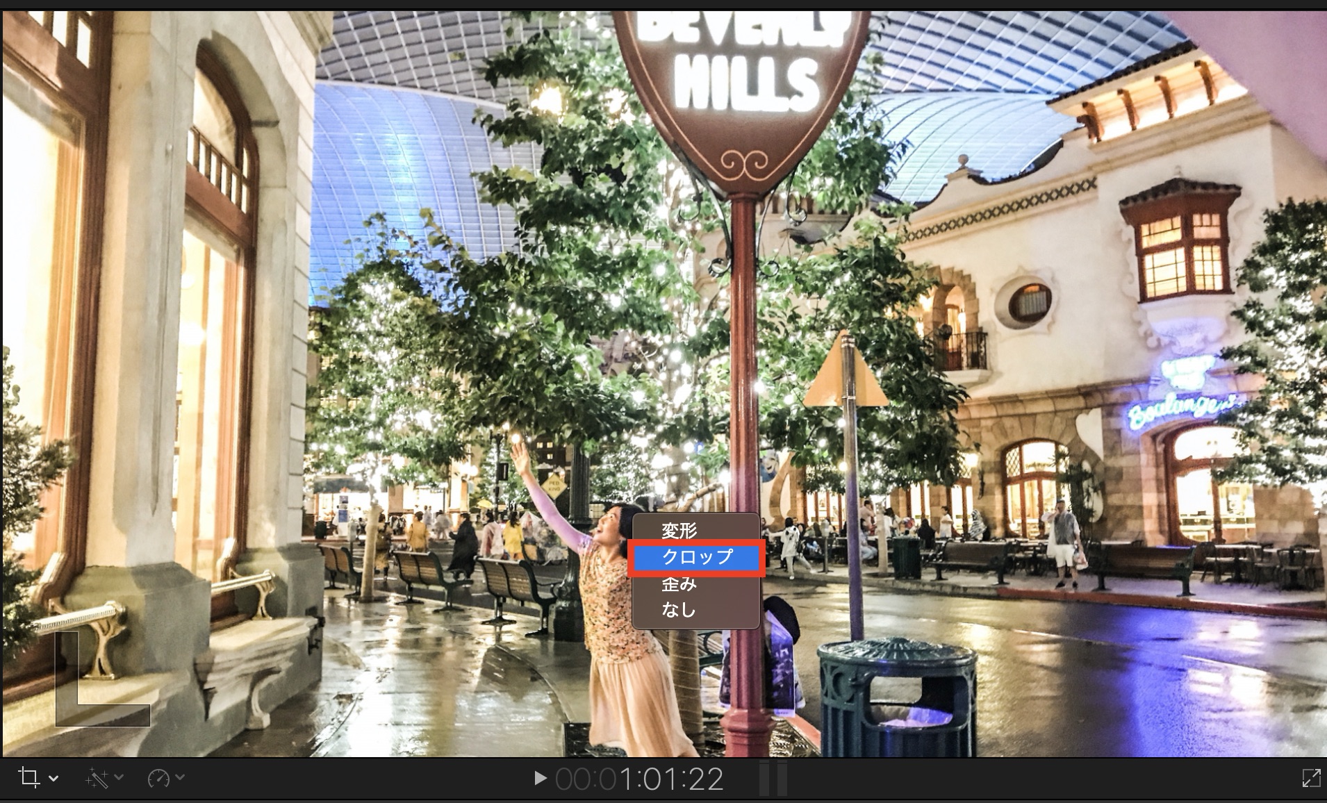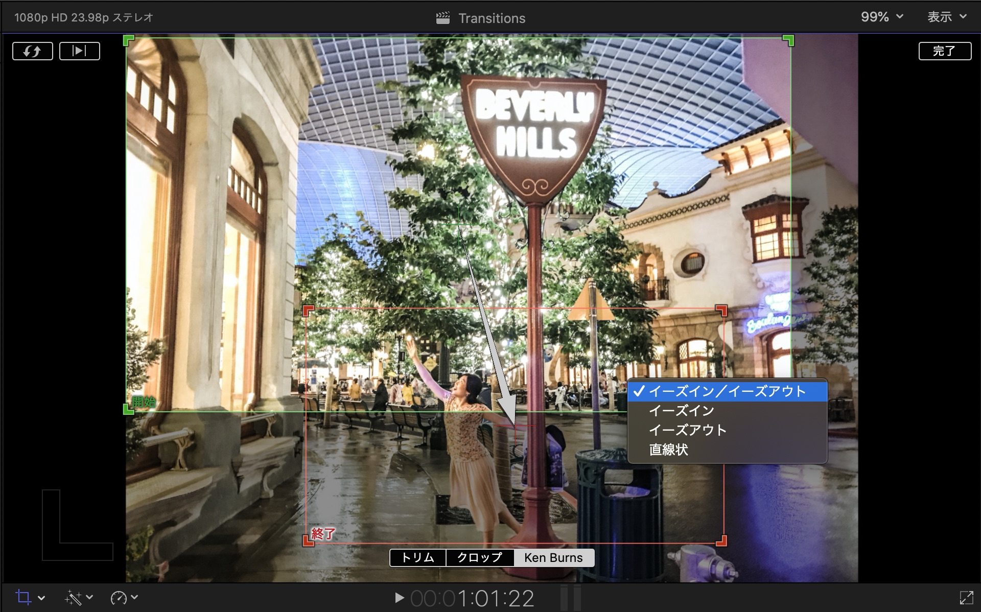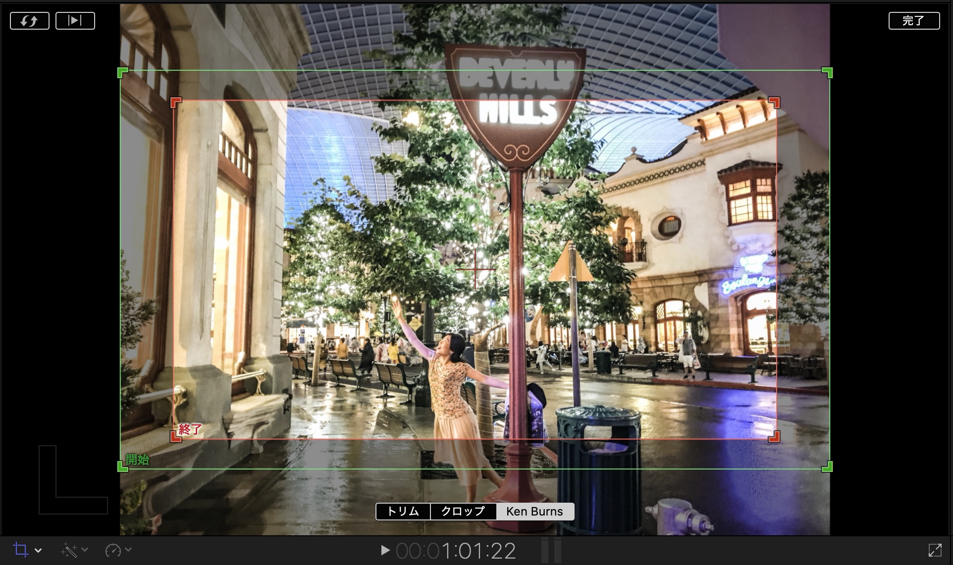 動きを変更する場合はビューアを右クリックして「クロップ」を開くと、iMovieと同じように開始と終了の位置を設定する画面になります。
