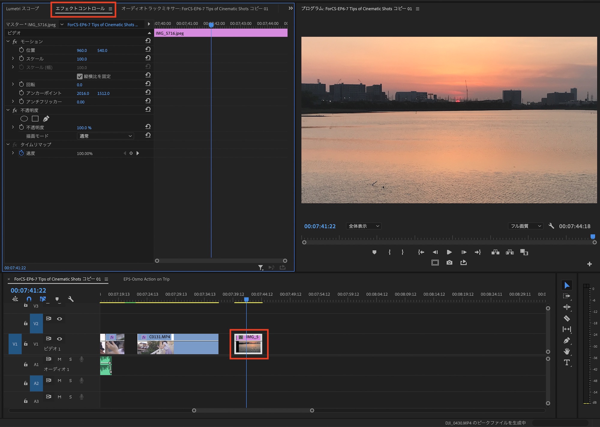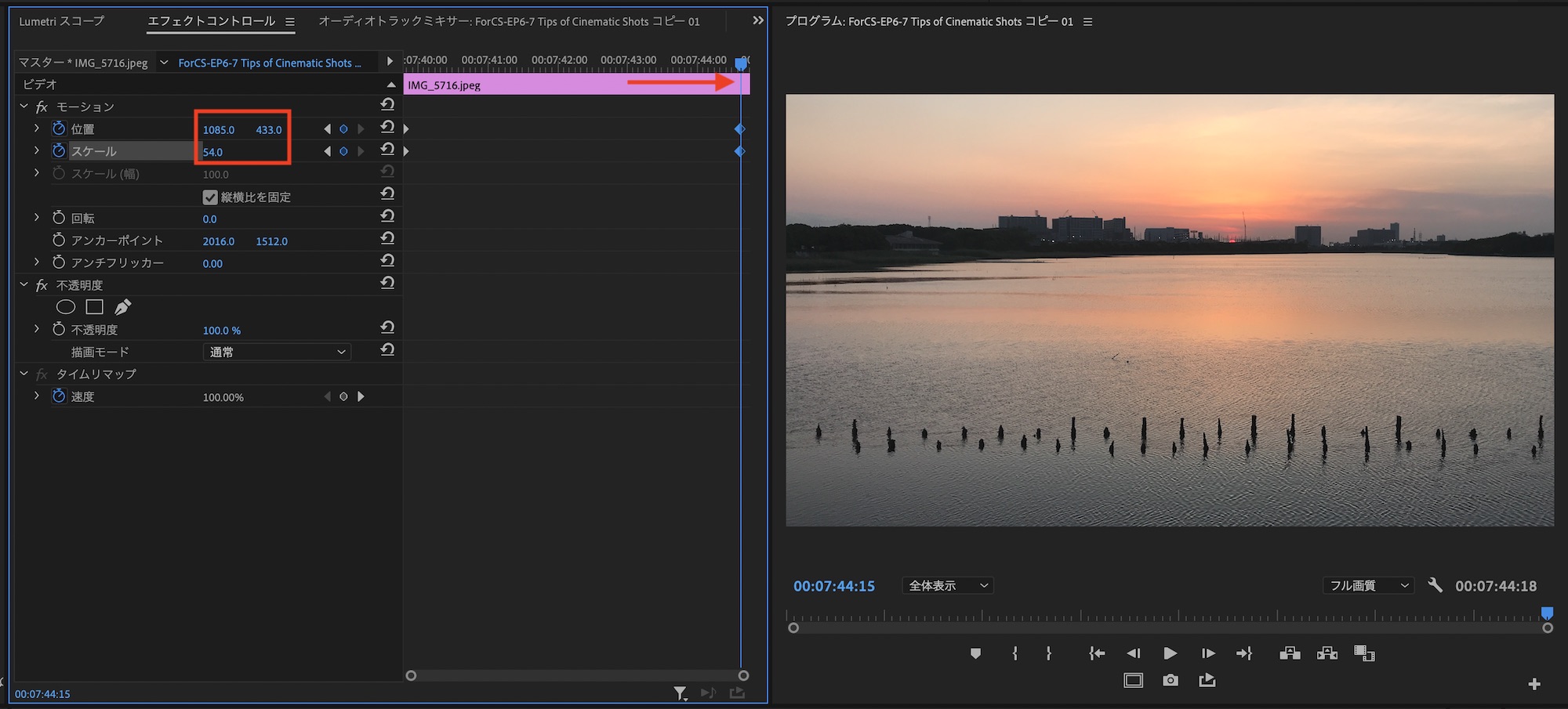写真をシーケンスに追加して、選択状態でエフェクトコントロールタブを開きます。