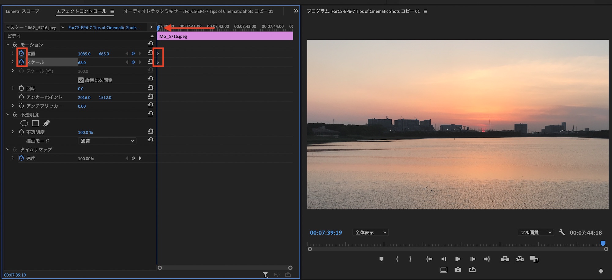 フレーム全体に写真が収まるようにスケールや位置を調整し、ストップウォッチアイコンをクリックしてキーフレームを追加。