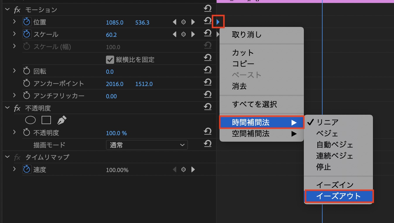 この画面でさらに右クリックすると「イーズイン/イーズアウト」のようにイージングの設定が行なえます。