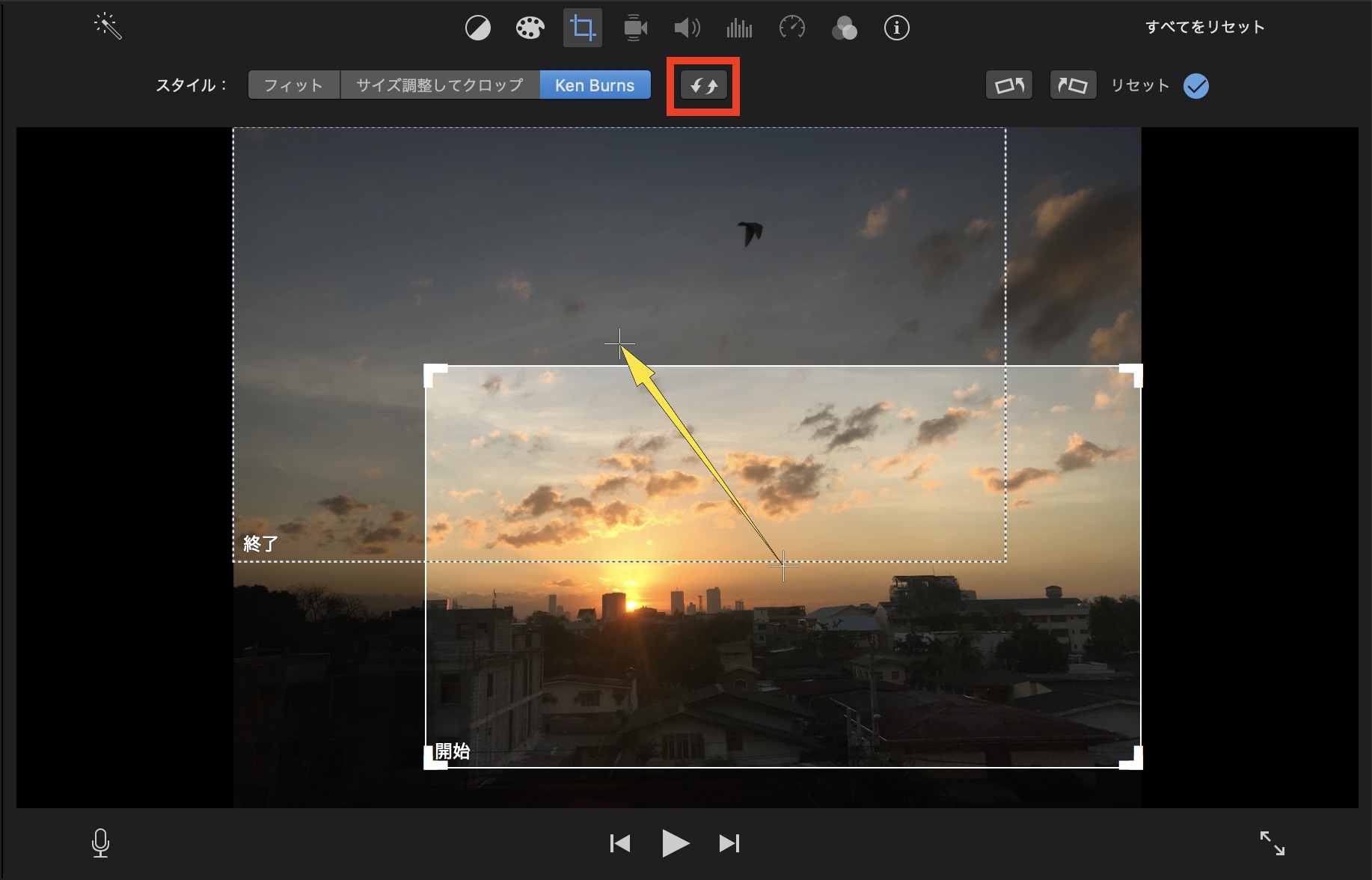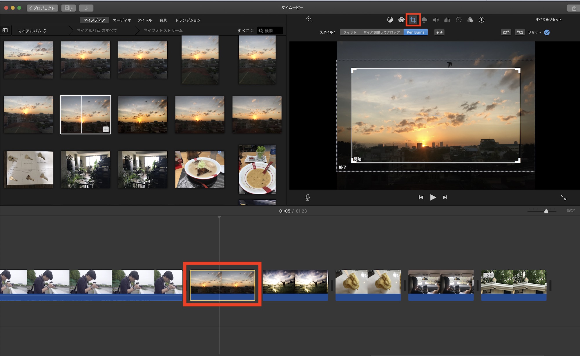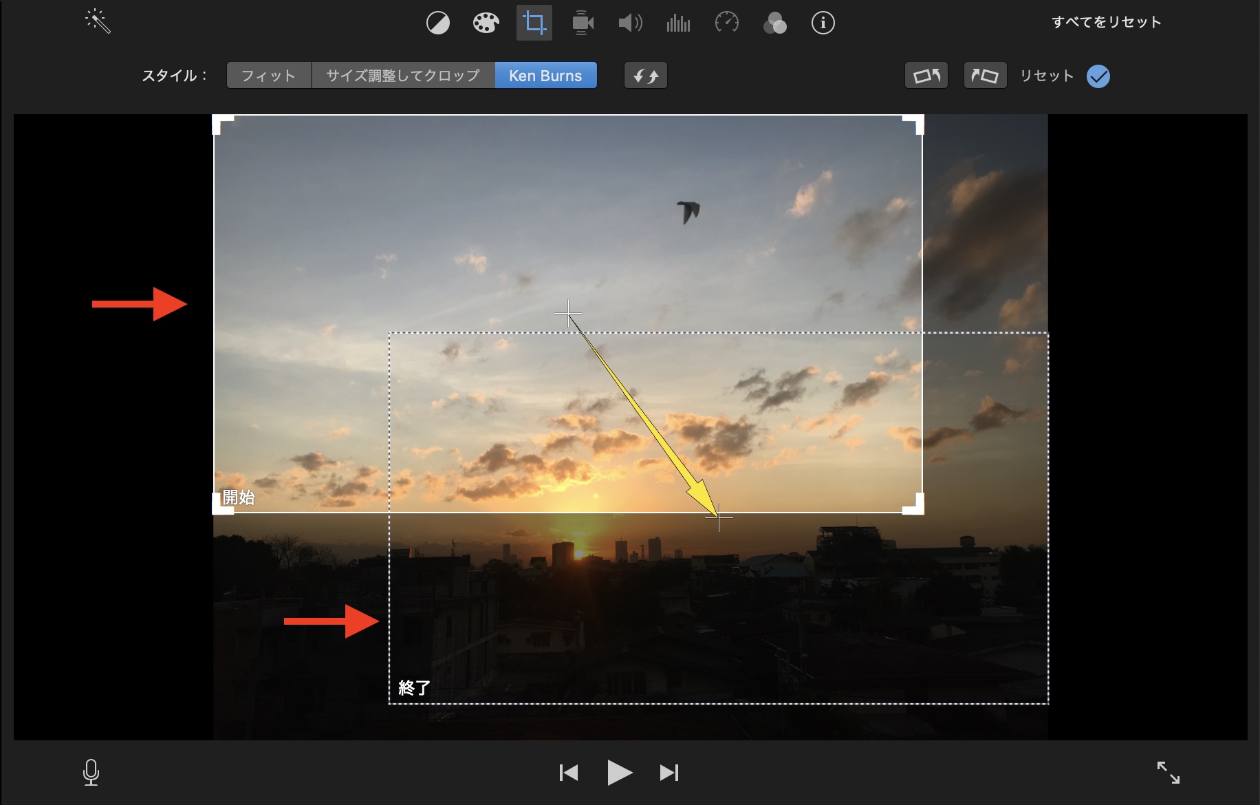 タイムラインにある写真をクリックして、上部ツールバーの「クロップ」を開くとKen Burnsエフェクトの調整が行なえます。