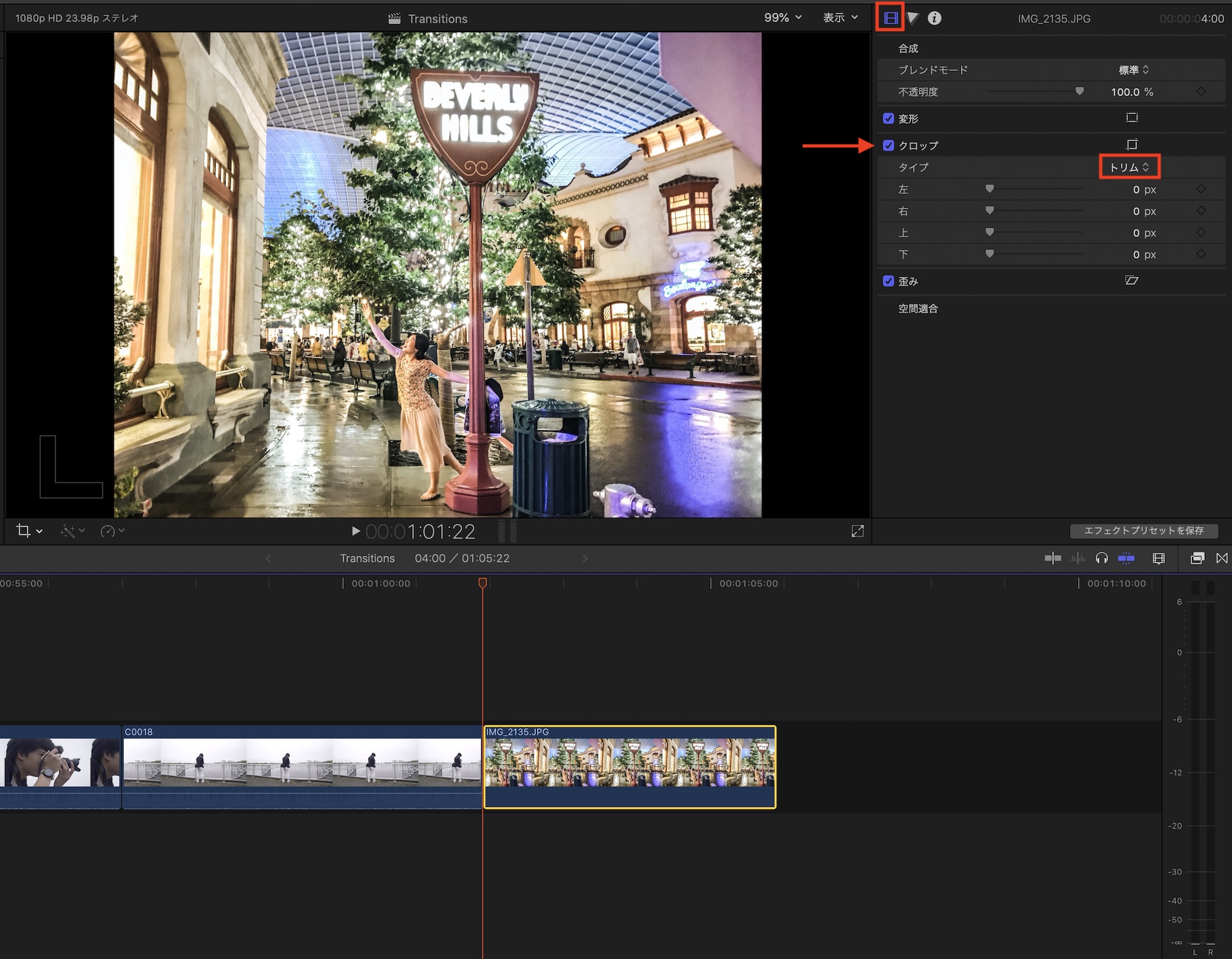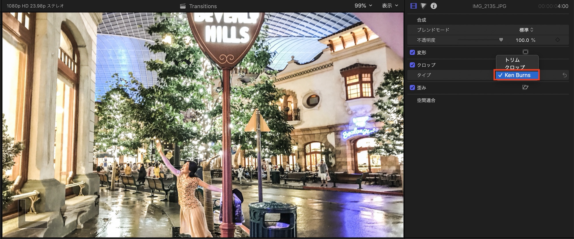 タイムラインに写真を追加した後はインスペクタを開き、「クロップ」の項目から「タイプ」を「Ken Burns」に設定すると自動で反映されます。