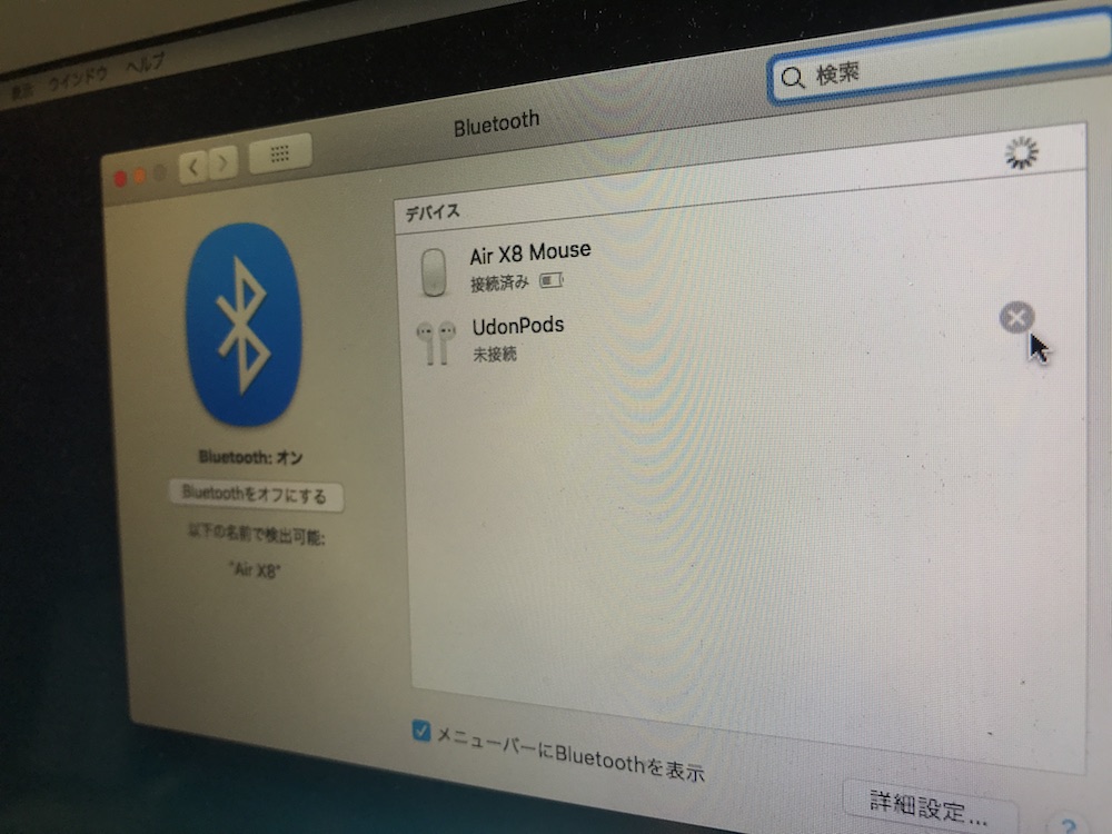 AirPodsをケースに入れた状態で環境設定から「Bluetooth」を選択し、デバイス一覧に表示中のAirPodsを選択します。すると右に「X」のアイコンが現れるので、アイコンをクリックしてパソコンとのペアリングを解除します。