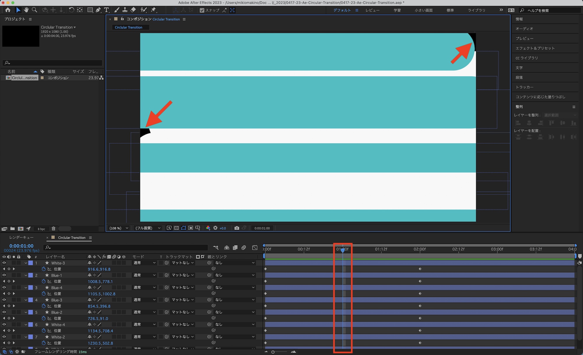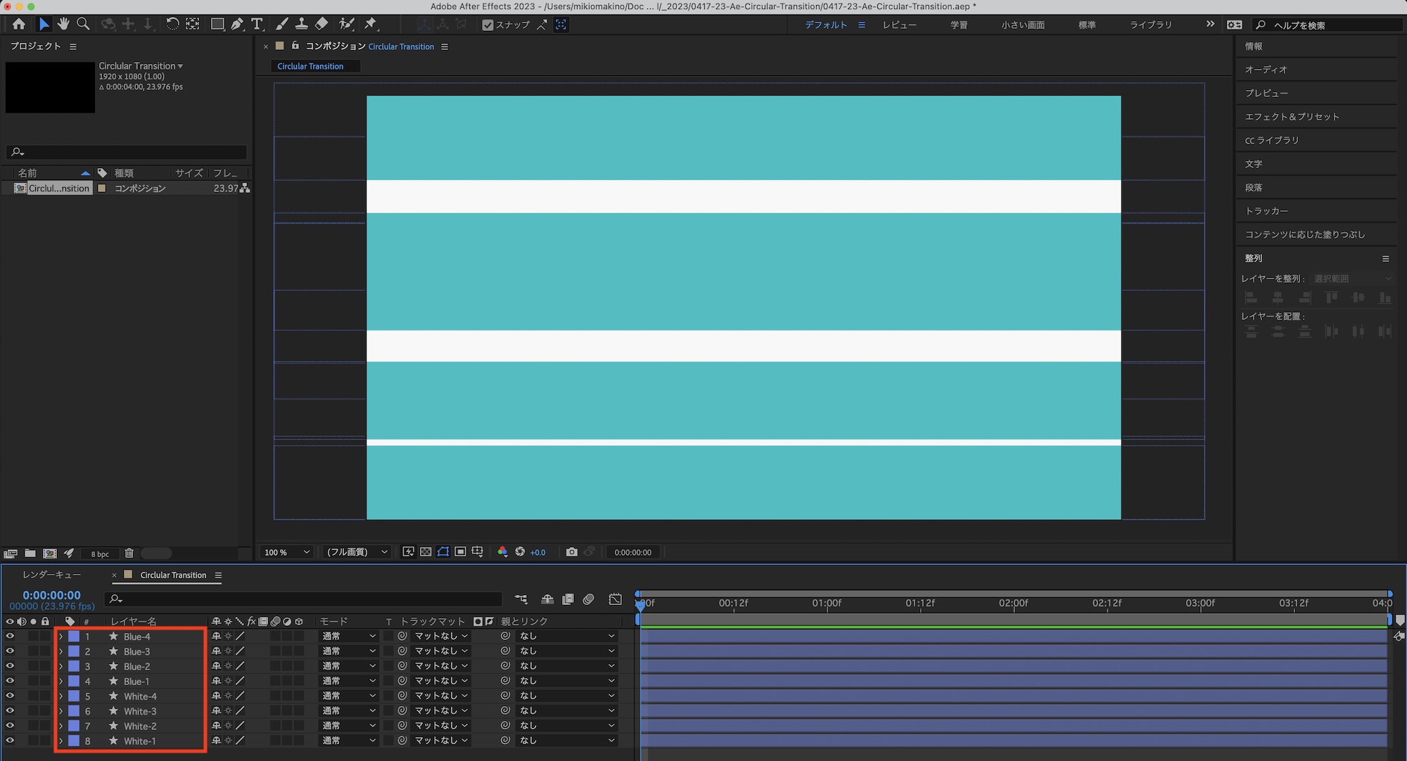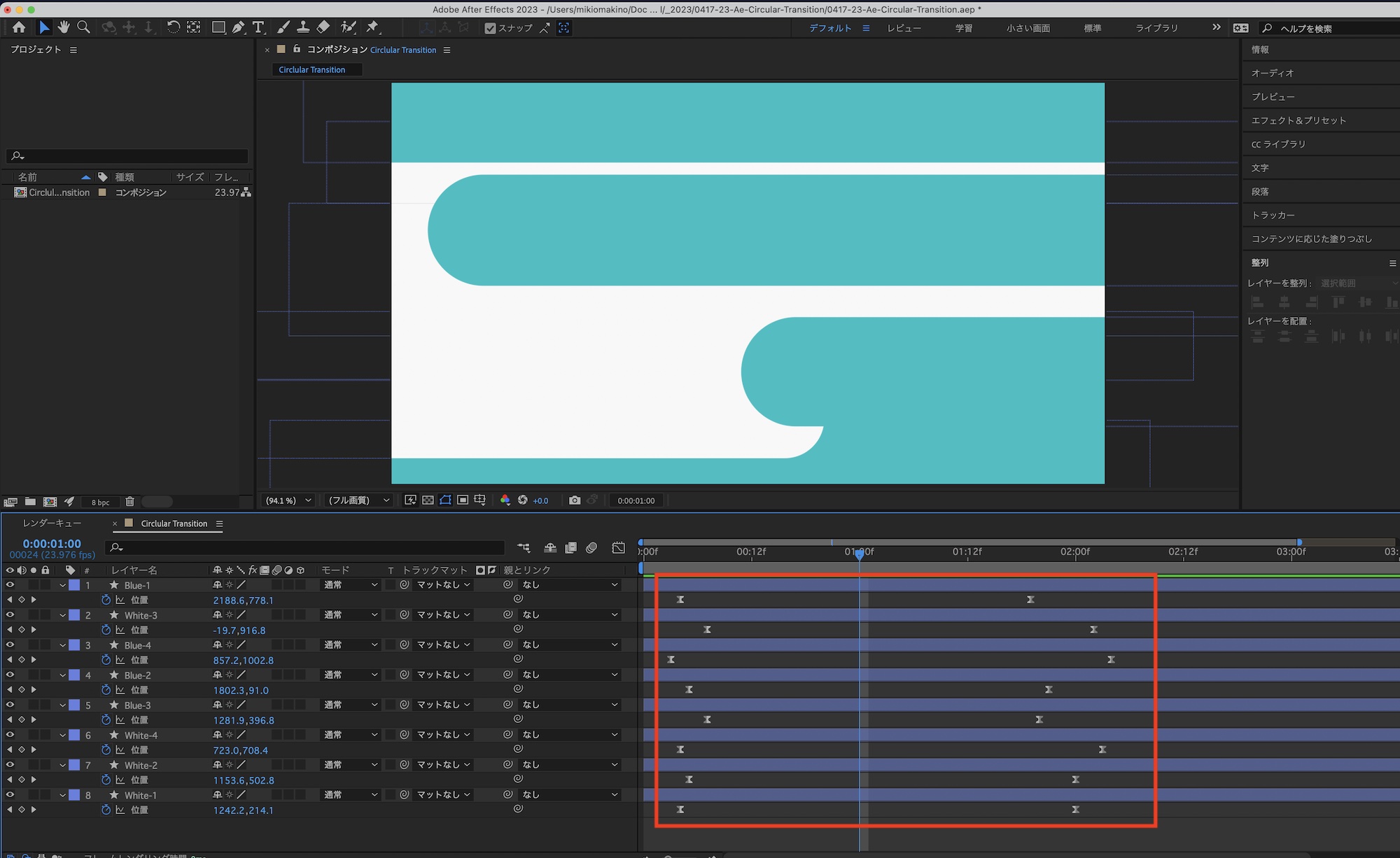 これでトランジションが完成します。After Effectsでそのまま使用する場合はプリコンポジションとして作成したり、エッセンシャルグラフィックスとして書き出してみてください。
