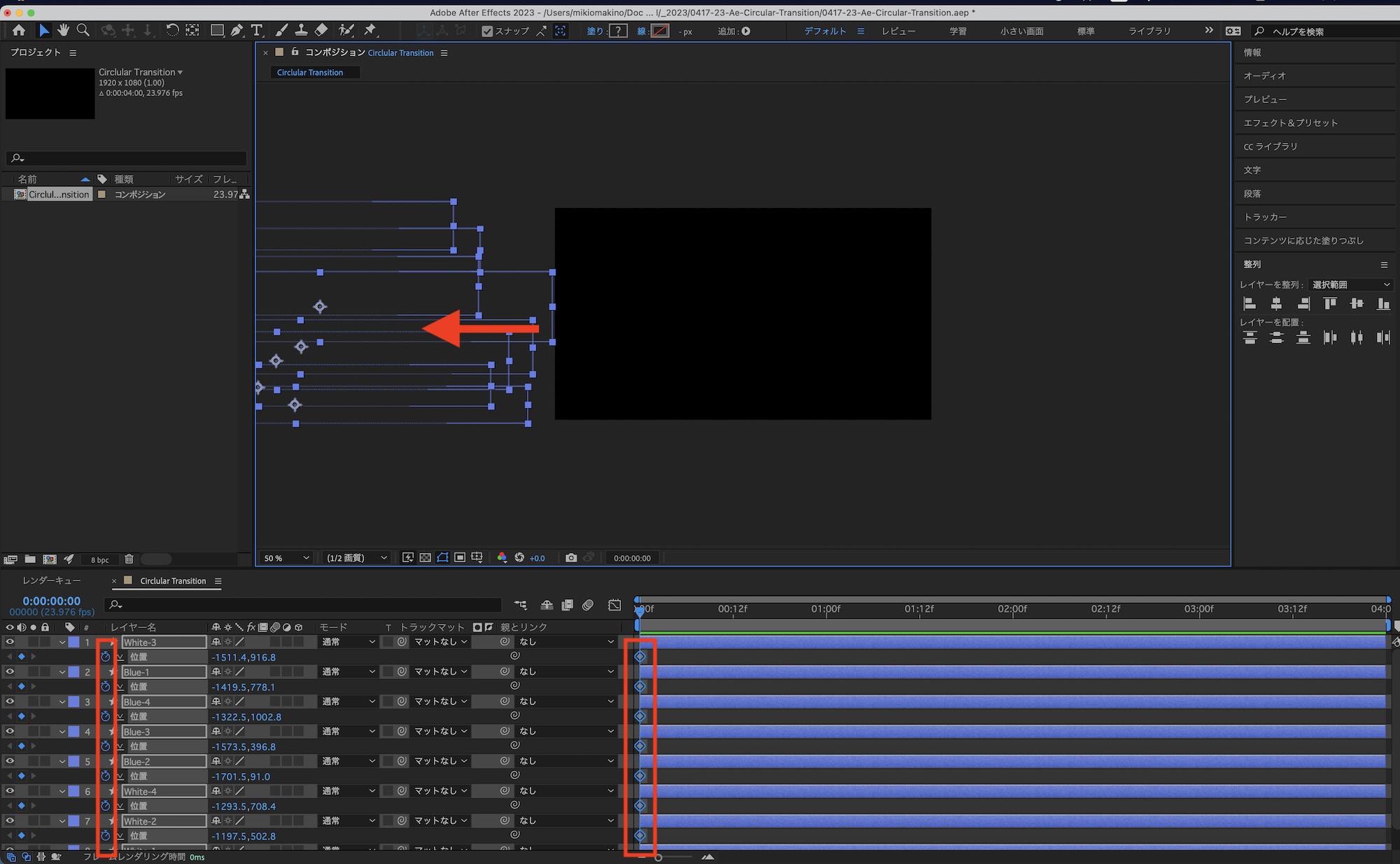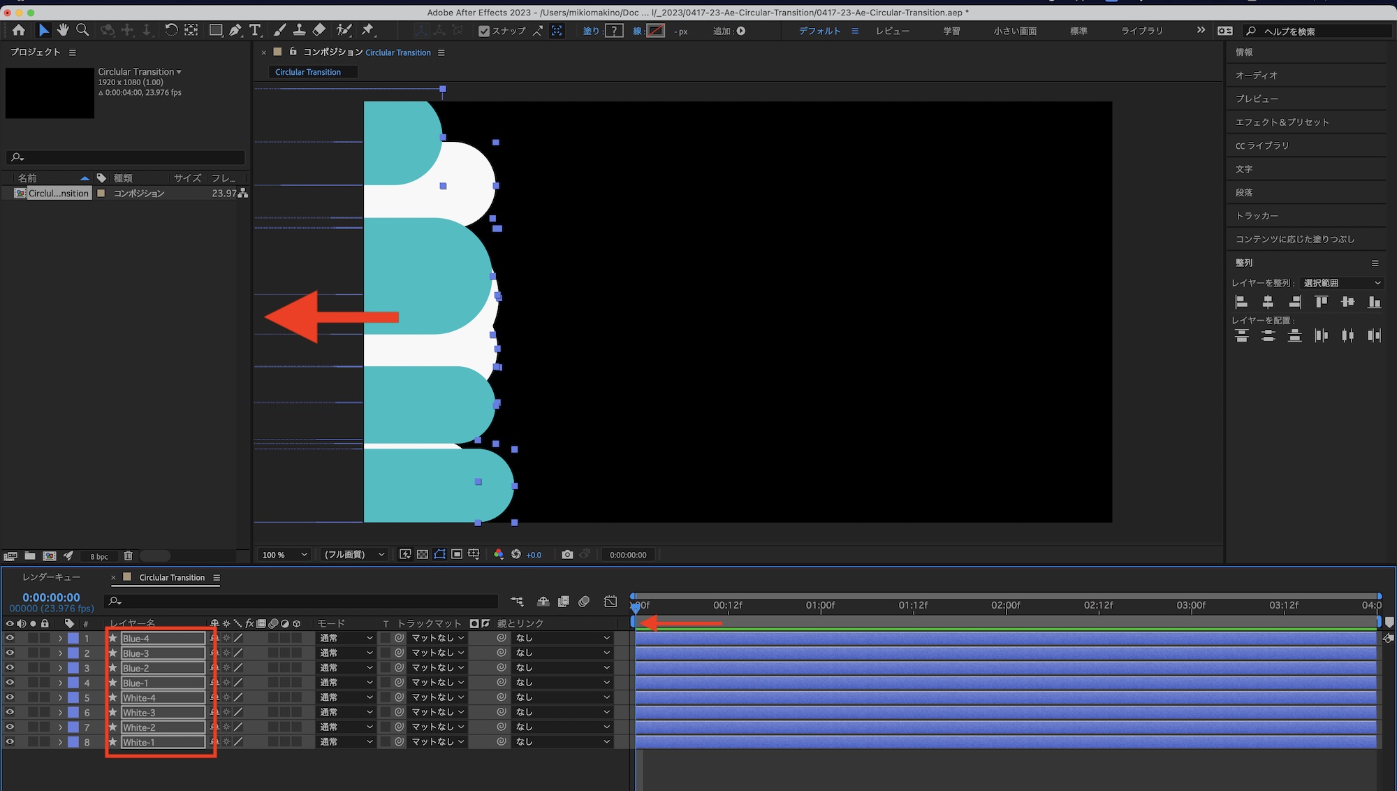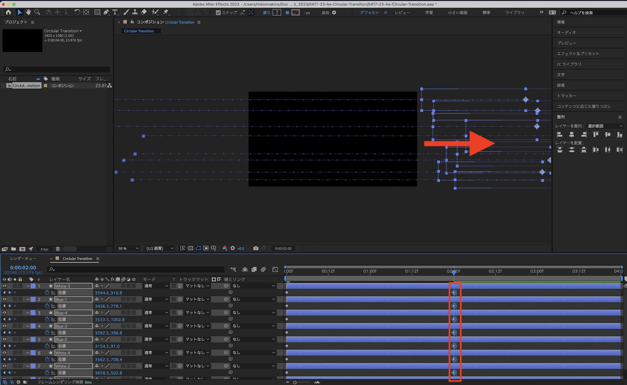 これでトランジションが完成します。After Effectsでそのまま使用する場合はプリコンポジションとして作成したり、エッセンシャルグラフィックスとして書き出してみてください。