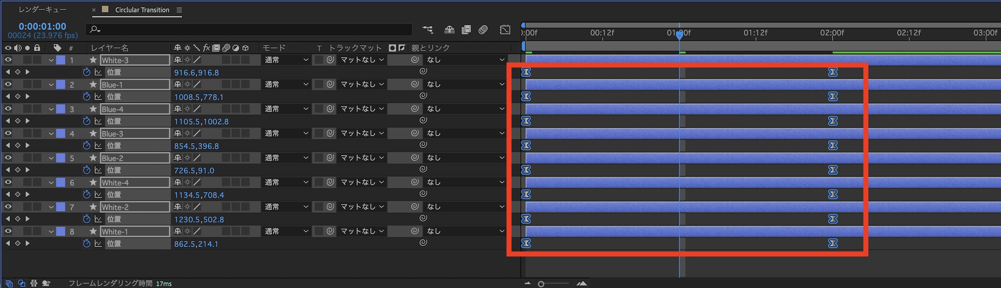 配置が完了したらレイヤーを全て選択し、「0秒」のタイミングでフレームの左側から現れるように位置を調整し、「位置」のストップウォッチアイコンをクリックしてキーフレームを追加します。