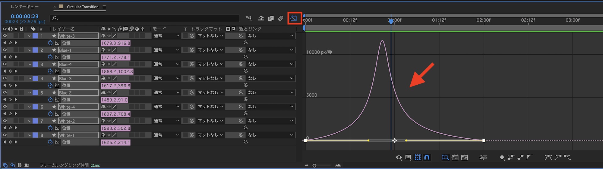 作成したキーフレームを全て選択し、「F9(mac: Fnキー + F9)」でイージングを追加し、グラフエディタでイージングの調整を行います。