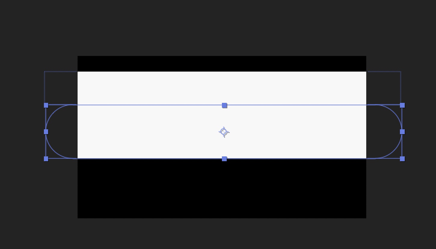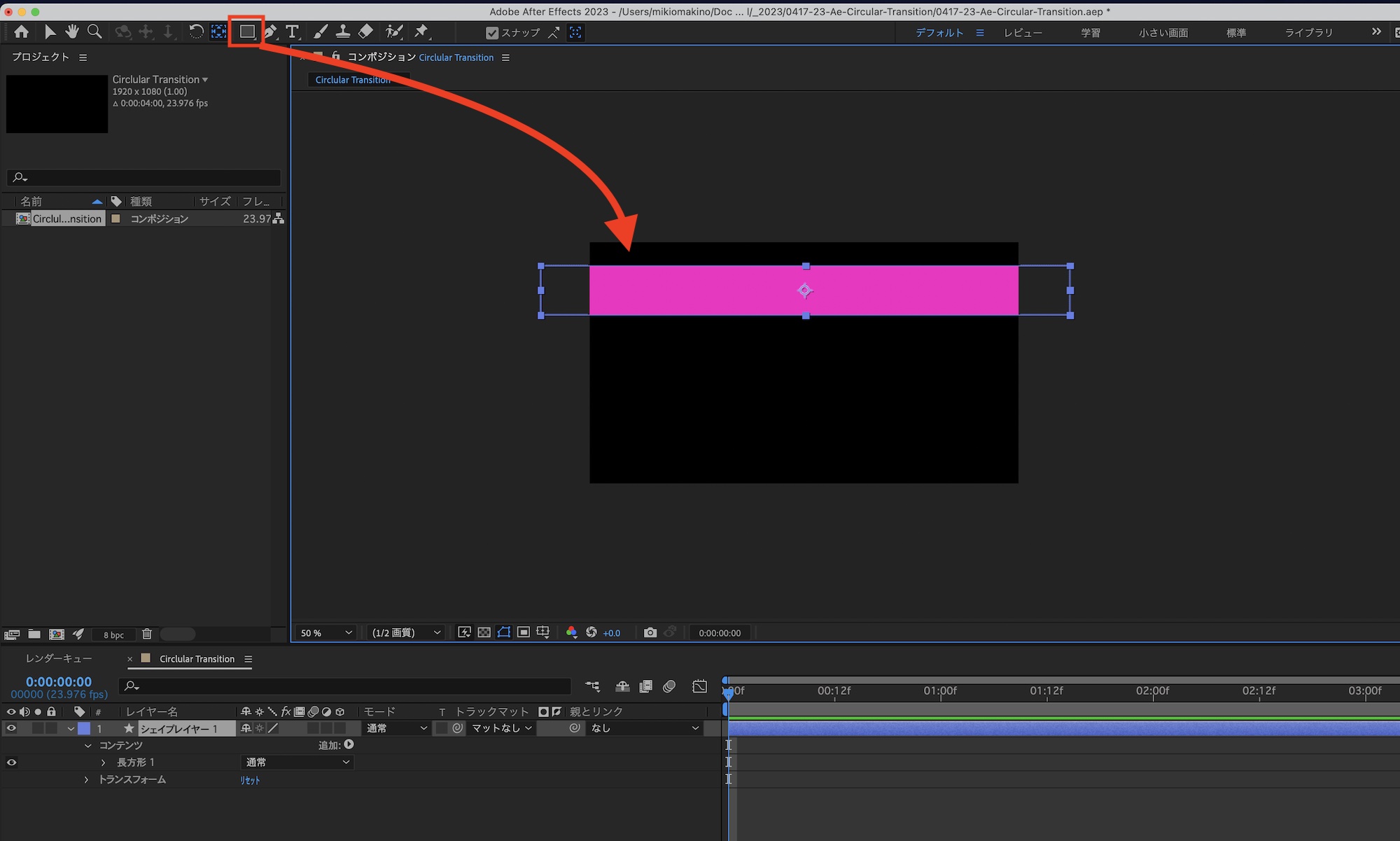 次にシェイプツールを使ってフレームの横幅よりも長い長方形を作成します。後ほど行うキーフレームでの操作もしやすくなるように、アンカーポイントをシェイプの中心に配置しましょう。