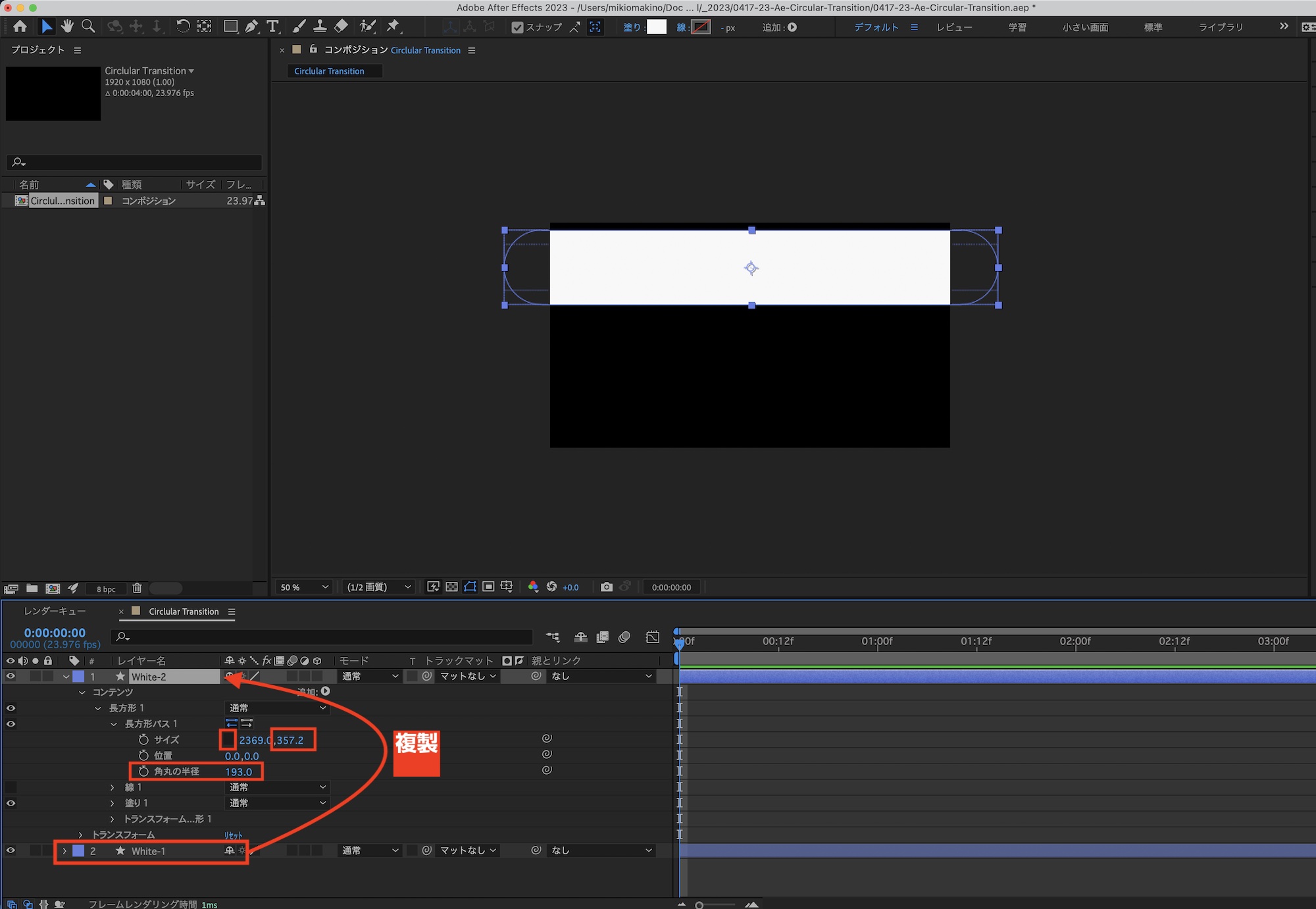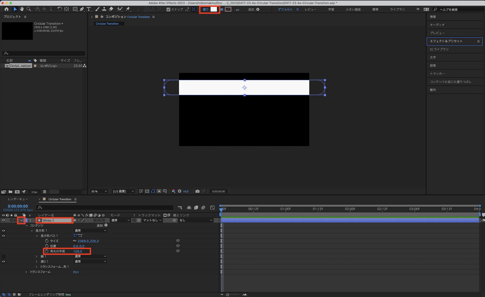 シェイプを選択し、上部ツールバーの「塗り」から色を変更します。次にタイムラインにあるシェイプの三角アイコンをクリックしてオプションを展開して、「コンテンツ」、「長方形」、「長方形パス」の中にある「各丸の半径」の数値を変更し、シェイプの角を丸くします。なお、名称はわかりやすく「White-1」にしました。
