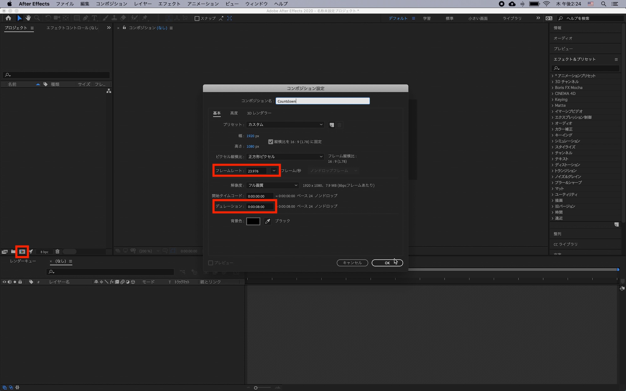 After Effectsで新規コンポジションを作成し、デュレーションを「8秒」に設定します。フレームレートは好みで良いですが、今回のチュートリアルでは「23.976fps」にしています。