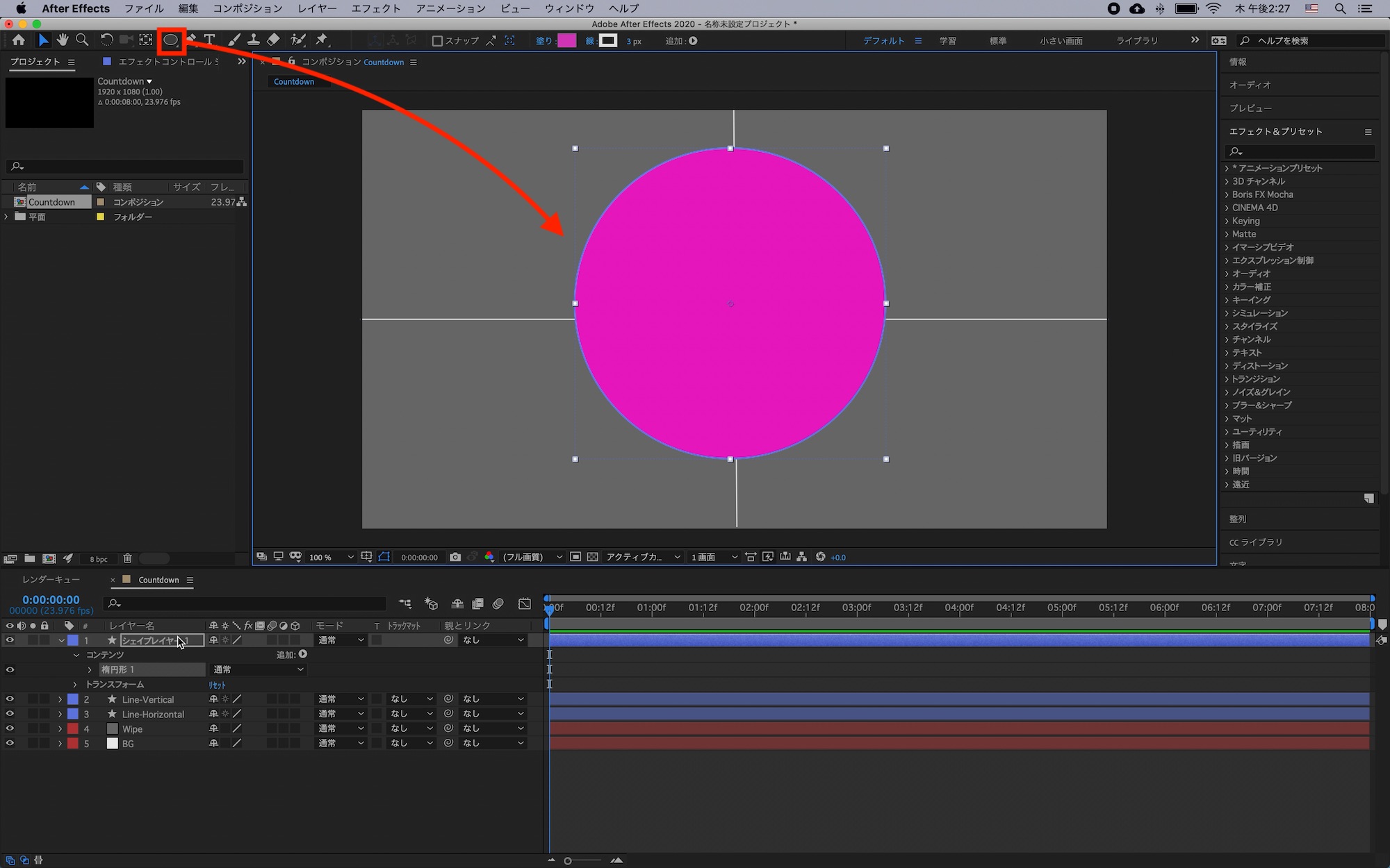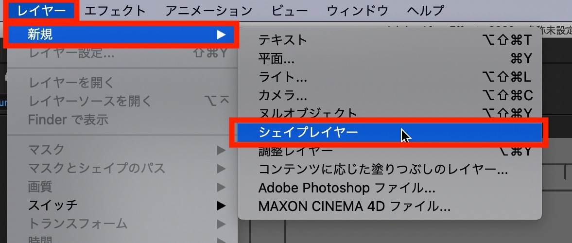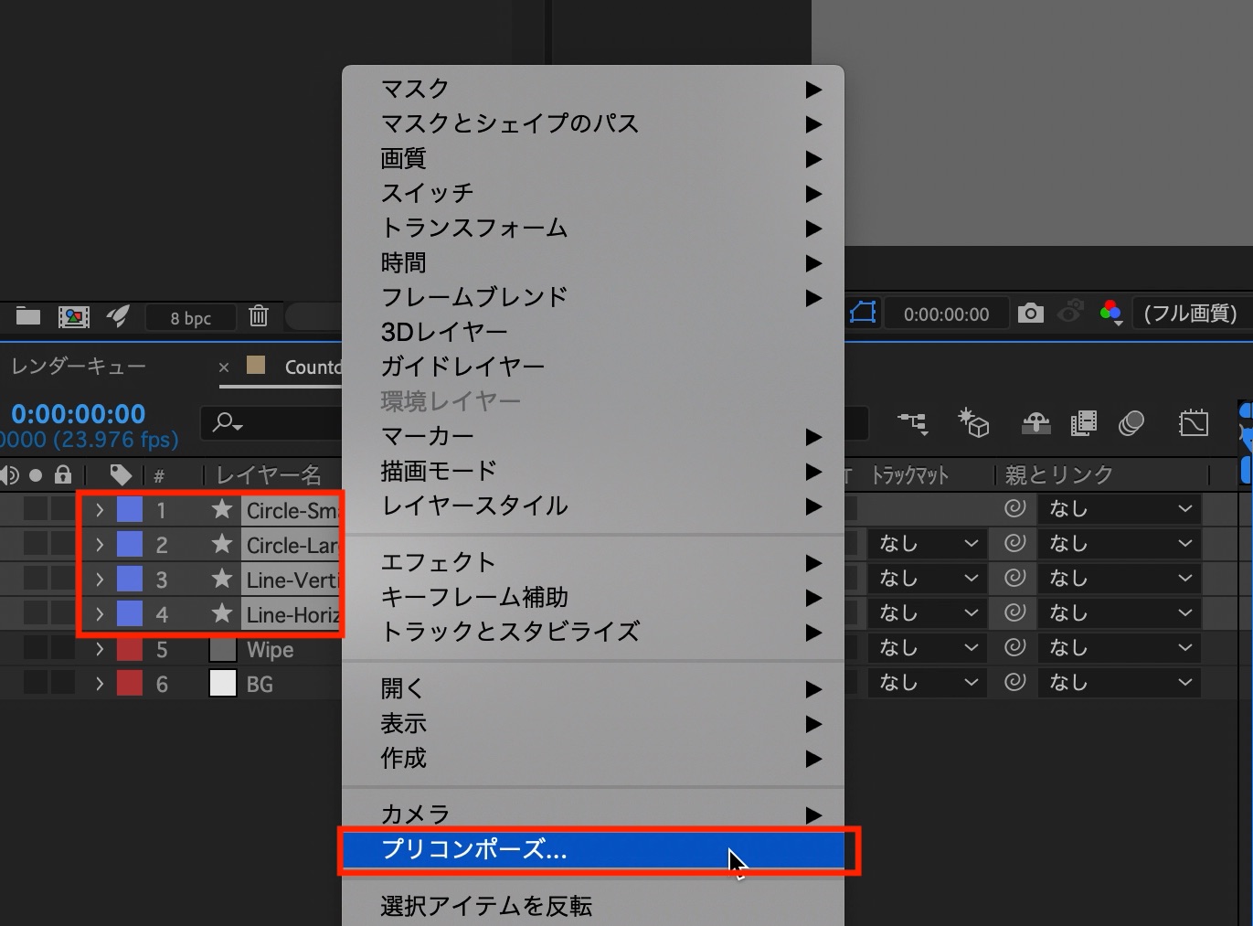 追加した全てのシェイプを選択して右クリック「プリコンポーズ」からプリコンポジションを作成しましょう。