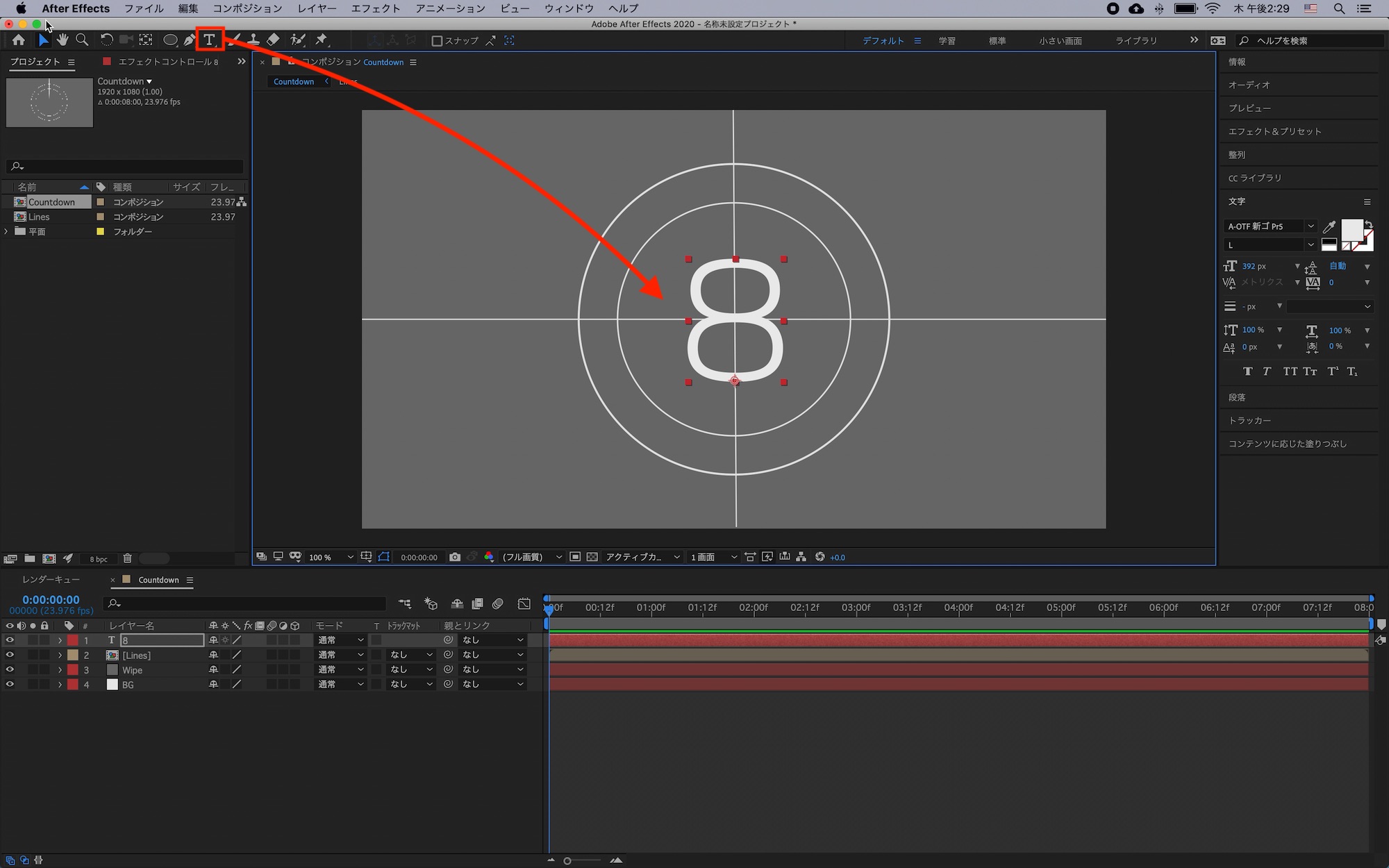 「8」のテキストレイヤーを「 7、6、5・・」のように複製し、テキストを変更した後はそれぞれのレイヤーを1秒ずつずらしていきましょう。