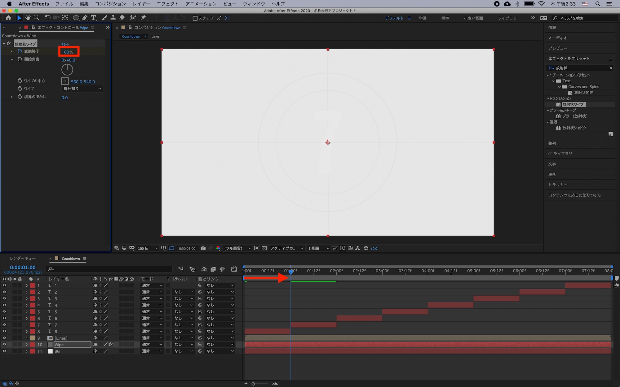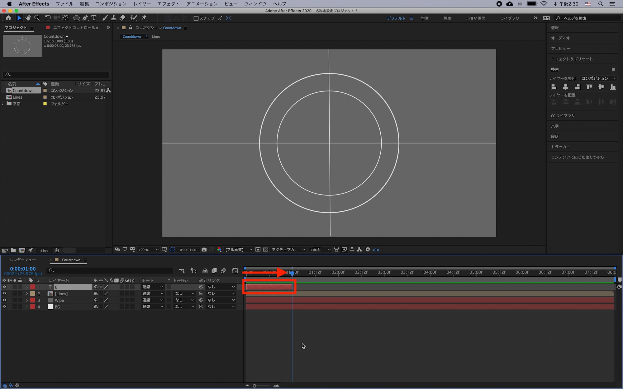 タイムインジケータを「1秒」に動かし、「Alt(Option) + 「」で数字のレイヤーが1秒になるように調整します。