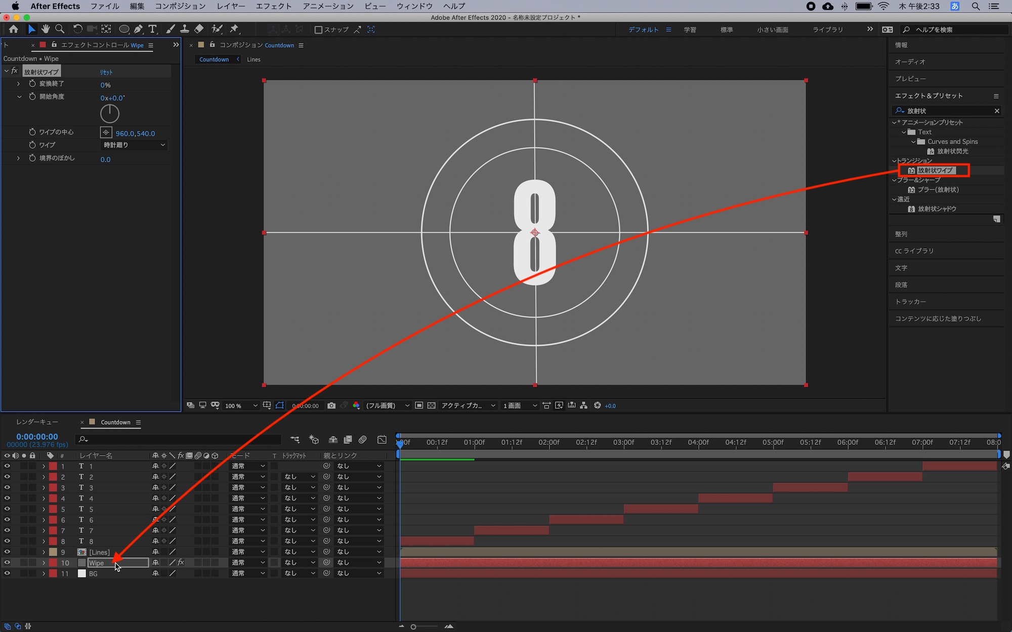 「Wipe」の平面にワイプを追加しましょう。「エフェクト&プリセット」のタブから「放射状ワイプ(Radial Wipe)」と検索し、「Wipe」の平面にドラッグ・アンド・ドロップします。