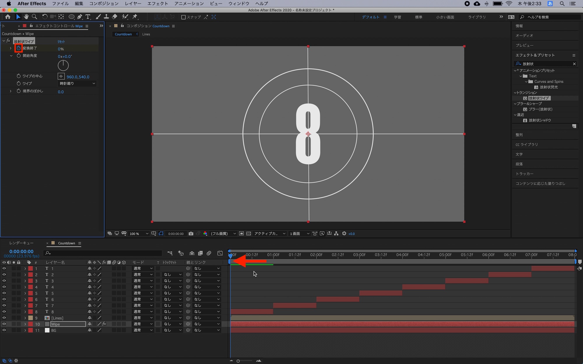 「Wipe」のレイヤーを選択して「エフェクトコントロール」を開き、タイムインジケータを0秒に移動させて、「変換終了」のストップウォッチアイコンをクリックしてキーフレームを追加します。
