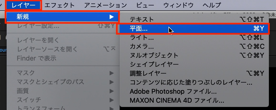 上部メニュー「レイヤー」、「新規」の「平面」から背景とカウントダウンで使用するワイプ用に2つの平面を追加します。色は後でも変えられるので、ひとまず白とグレーにしています。