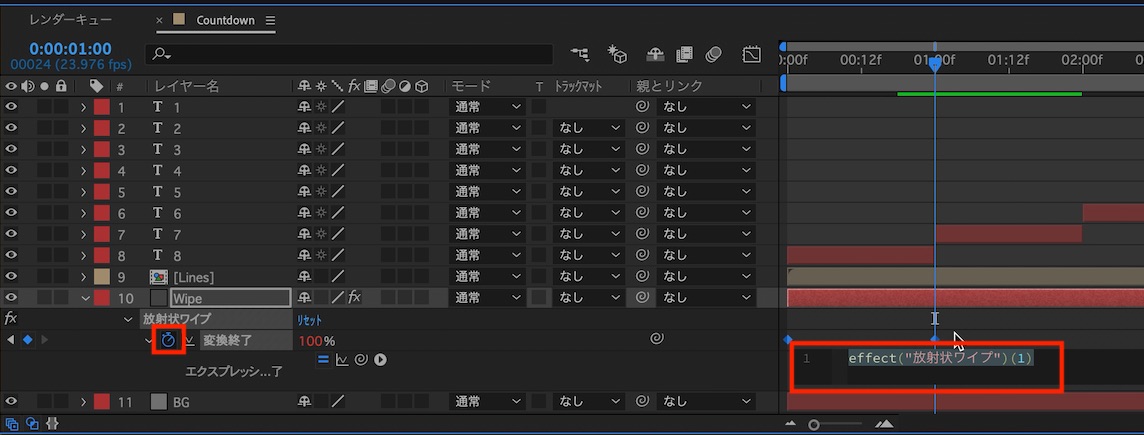 「Wipe」レイヤーを選択、「Uキー」でプロパティを開き、「Alt(Option)キー」を押しながらストップウォッチアイコンをクリック。