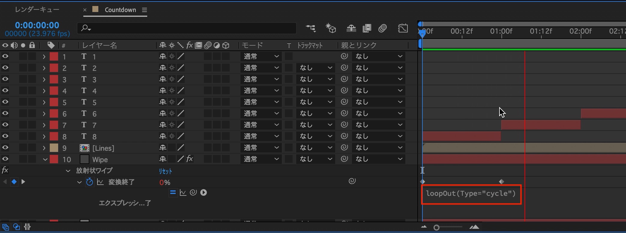 するとエクスプレッションが入力できる画面が現れるので、「loopOut(Type=”cycle”)」を追加し、ワイプをループにします。