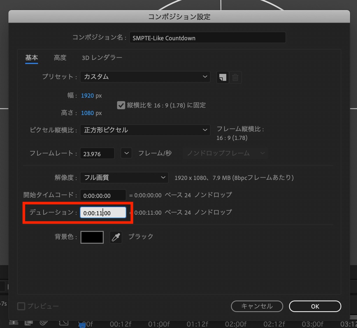 SMPTEユニバーサルリーダーのようにフィルムリールの情報などが入るデザインを作ってみたい方はコンポジションを「11秒」にしましょう。